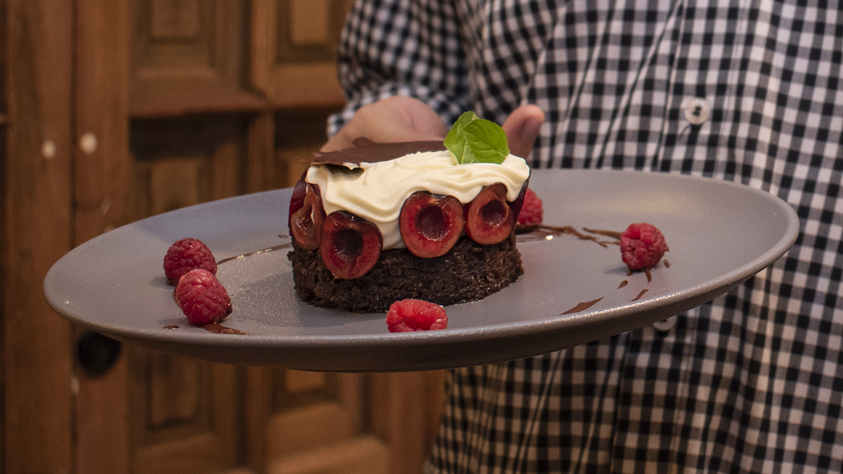 El chocolate está representado por la Selva Negra con frutos rojos maridada con un shot de vino Malamado y también por un ganache de chocolate semi amargo con ralladura de naranja más una bocha de mousse de chocolate blanco.