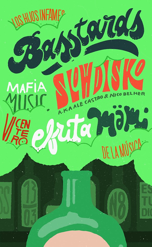 Ya son cinco los años que vive en Buenos Aires «trabajo freelance, vivo con mi novio y mi gata», dice. Pero este fin del 2017 y comienzos del  ´18 ha decidido quedarse en su ciudad natal, Mendoza, para trabajar en la imagen de un nuevo bar boliche «Parador Burzako», junto a  Nahuel Arrué. Afuera y adentro del lugar se puede apreciar su arte lleno de color, caligrafía y con un estilo único. «El año pasado (por 2016)  hice la gráfica del primer parador burzako (donde estaba antiguamente El Sodeado) que fue una especie de prototipo. Ya para este año quise hacer una imagen más sólida, con imágenes más grandes en donde en cada pieza se pueda identificar qué es el lugar. Fue un trabajo de gran magnitud por eso elegí trabajar en grupo con Nahuel. Los disparadores fueron que la gráfica tuviera que ver con lo lúdico, con la música, con la fiesta, con la alegría y en donde la gente se pueda sentir representada», agregó.