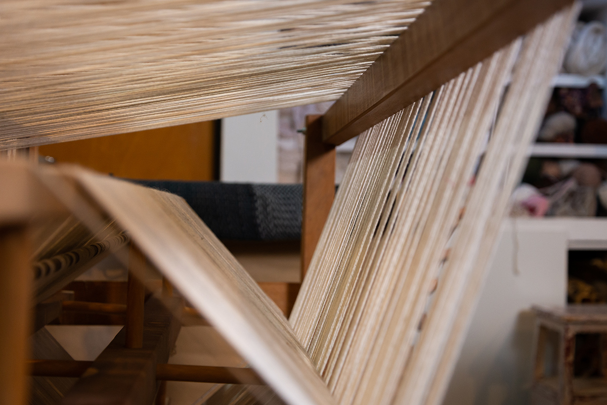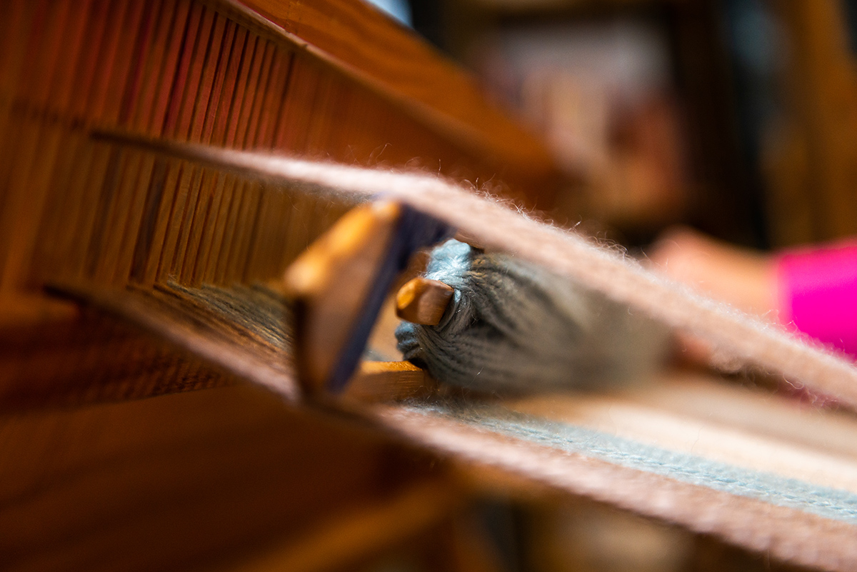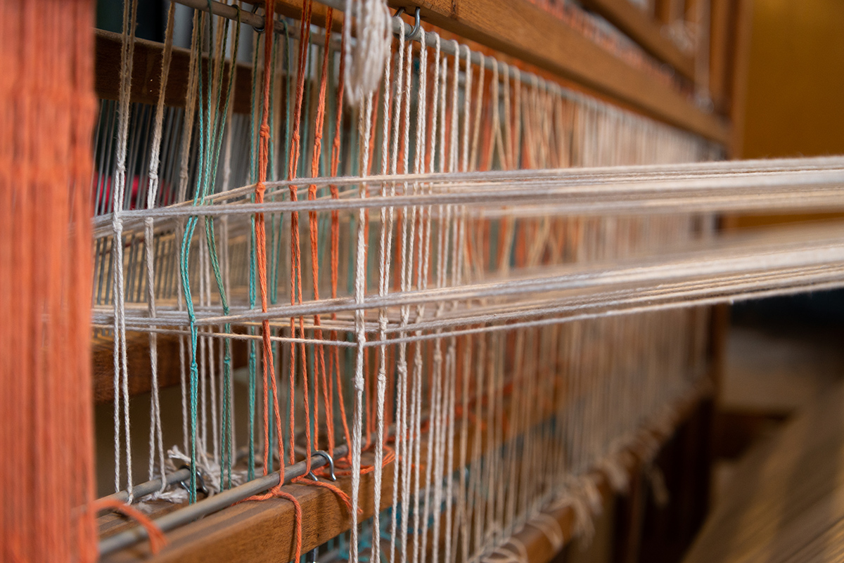 Su trabajo es completamente artesanal, realizado principalmente con telar de peine y telar de pedales, herramientas manuales que no están conectadas a ninguna fuente de energía más que a su propia destreza y dedicación.