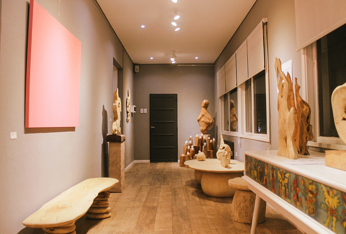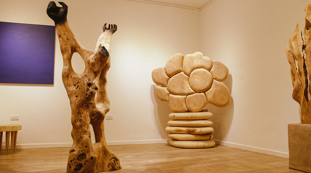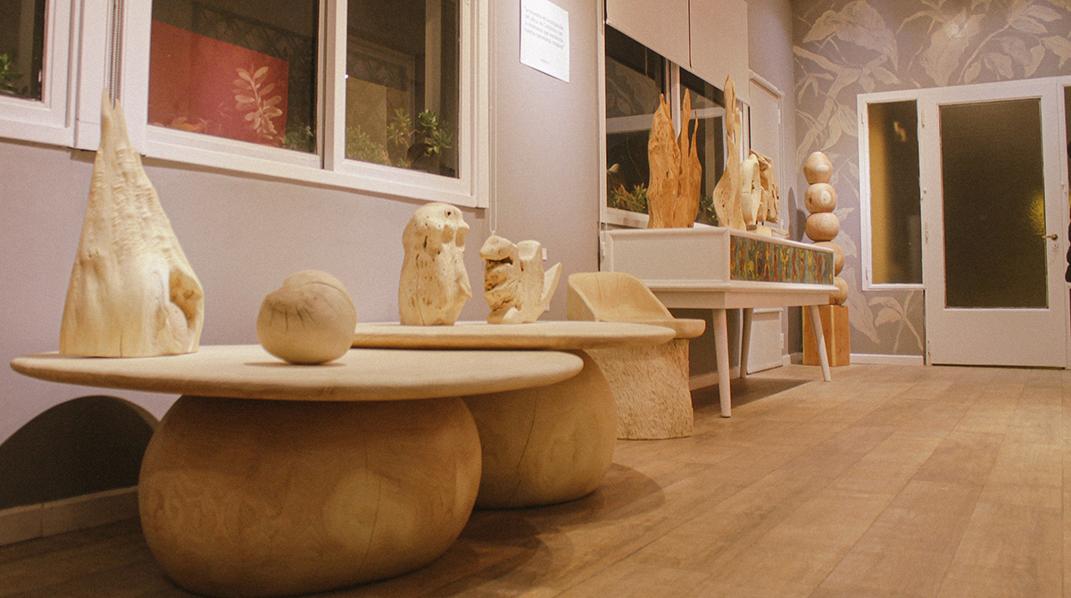 Cada una de las piezas que dan forma a la muestra están relacionadas con la naturaleza: algas, animales, plantas y criaturas marinas emergen de su mente y toman forma en madera de olivo y paraíso.