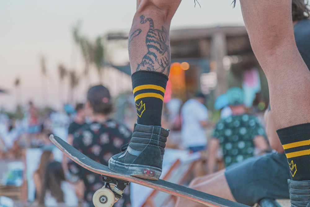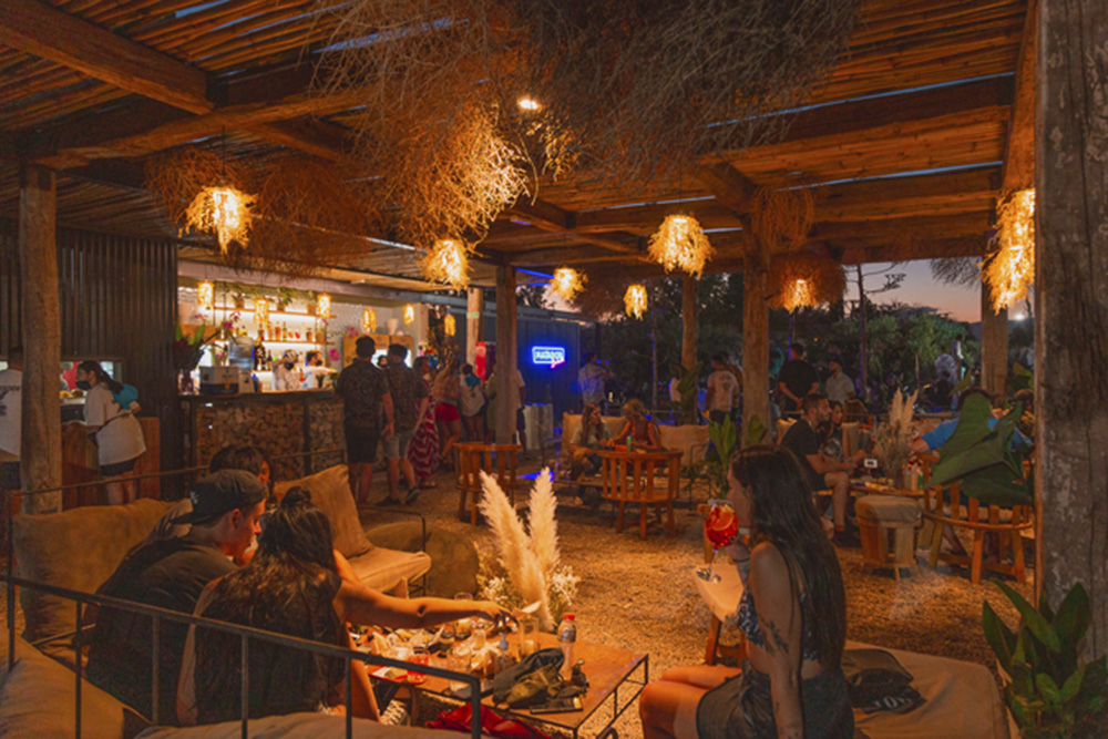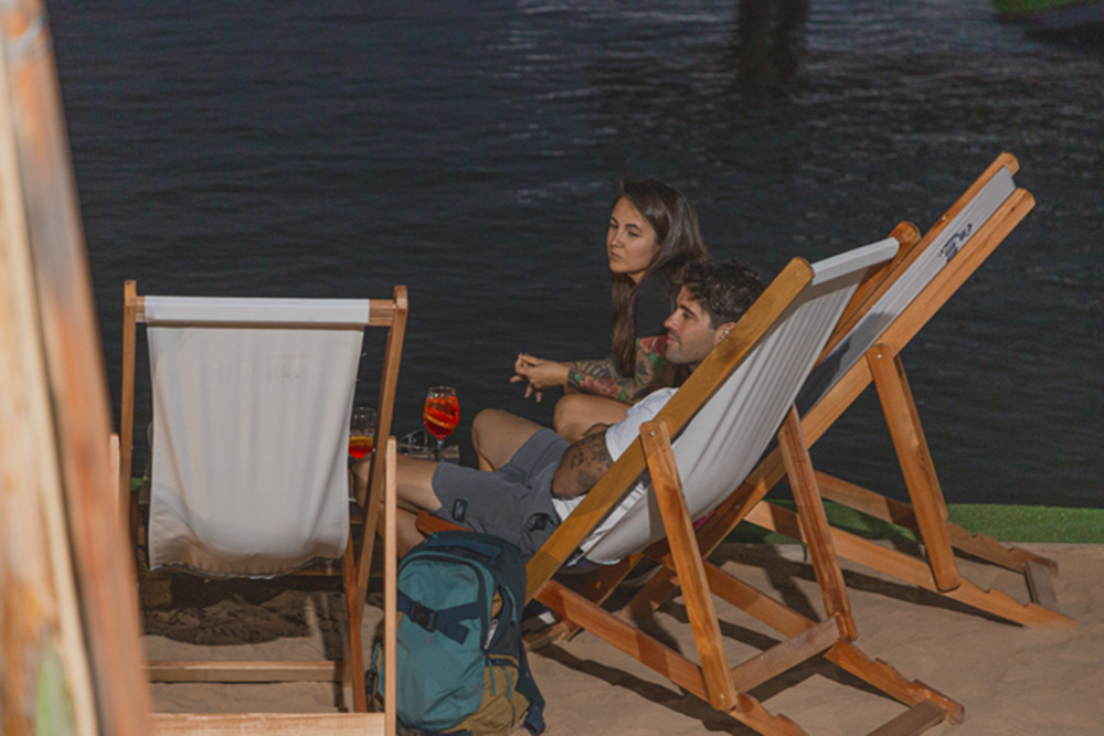 Las lámparas del bar, ideadas para colgarles vegetación autóctona, en este caso cardos y estepas, protagonizan la ambientación nocturna. A todo esto se suma en la tienda de deportes un deck con el mobiliario de Concuerdas: reposeras, sillas voladoras y hamacas creadas por Emi Prato y Gabi Bustos.