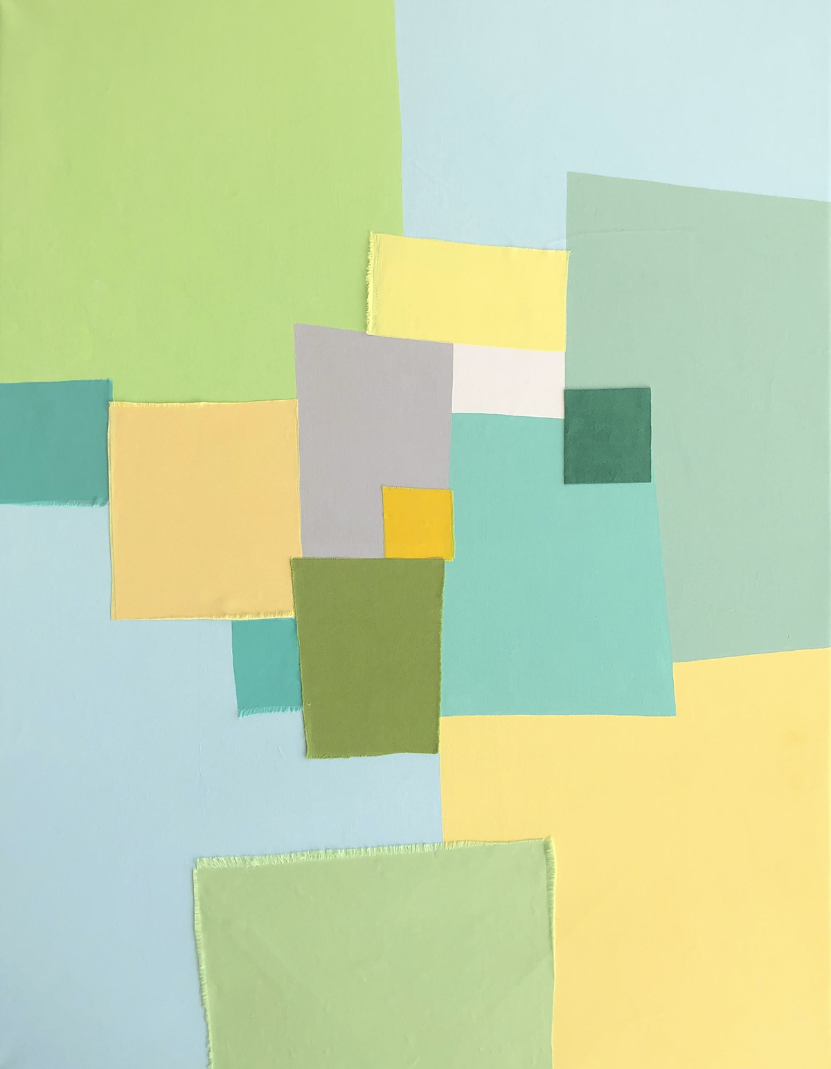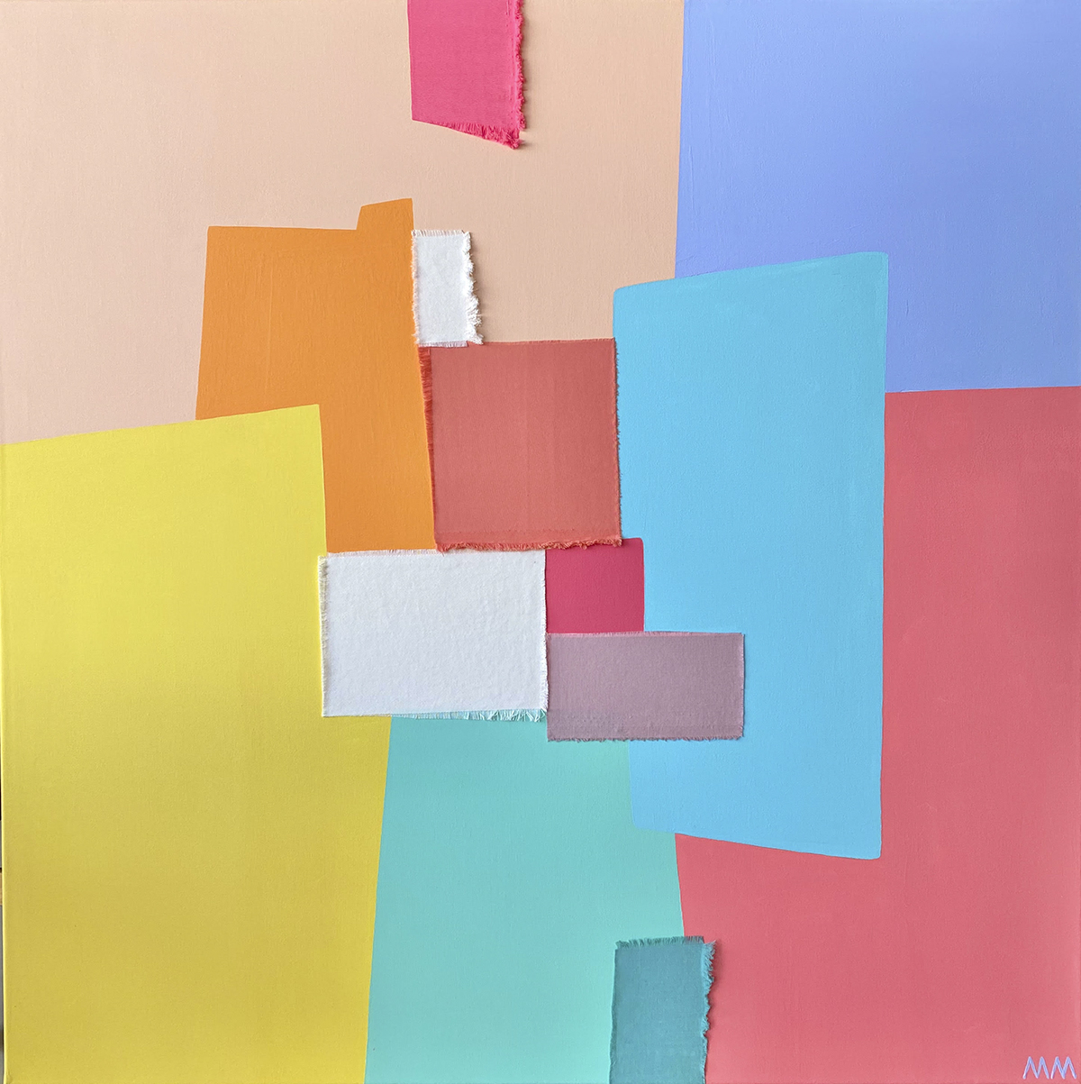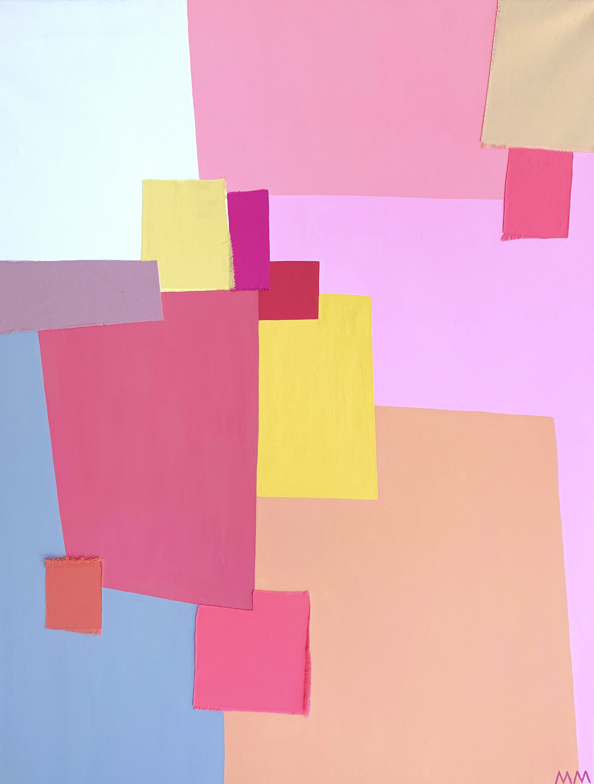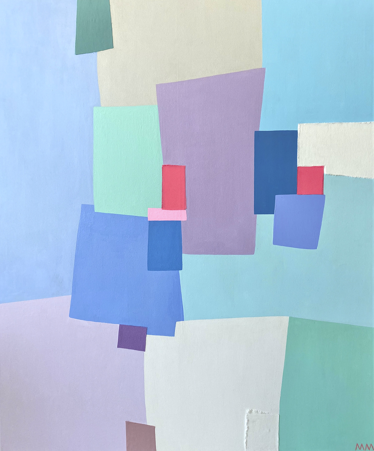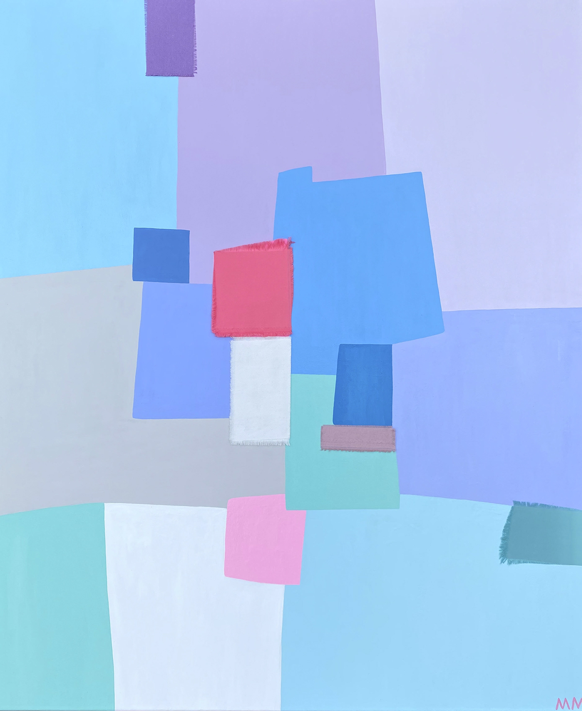 Me siento muy identificada con mi paleta de colores, todas las colecciones han sido apasteladas -o pastel- y al mismo tiempo vivaces. No uso colores oscuros ni negros. Mi obra actual es contemporánea, deconstructivista y forma parte del expresionismo abstracto ya que es una exploración de los sentimientos, emociones y conceptos a través de formas geométricas, trazos con líneas asimétricas y colores depurados. Es una expresión de arte perfectamente imperfecto, que permite al espectador cerrar la obra a su imaginación.