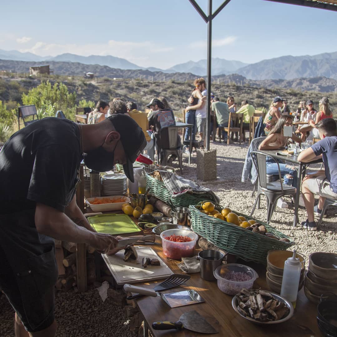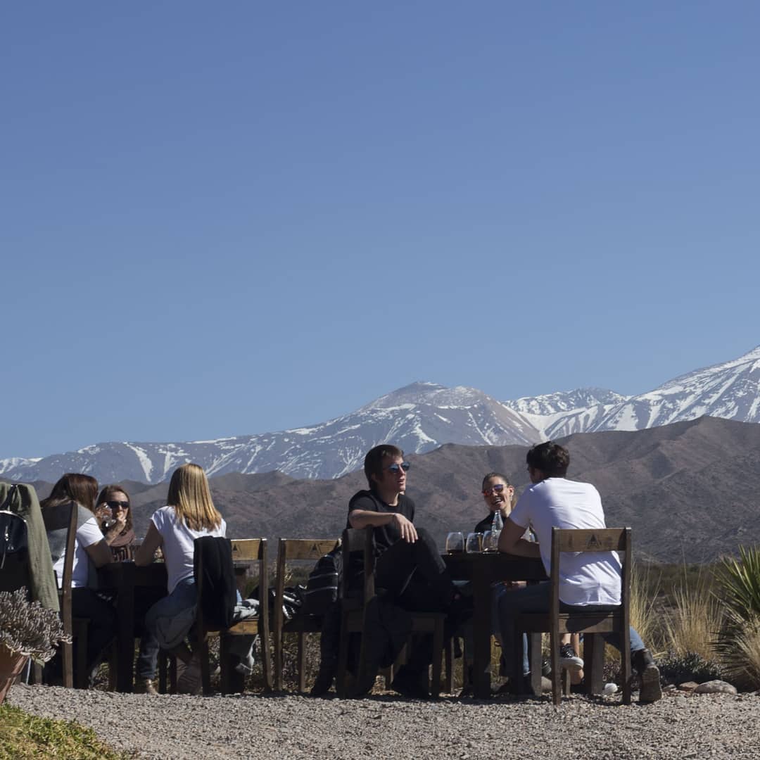 Además de degustaciones con vista a la montaña o en su cava subterránea. Los atardeceres en este sitio son alucinantes porque con copa de vino en mano se disfruta de un menú descontracturado viendo cómo el sol se esconde en el horizonte.