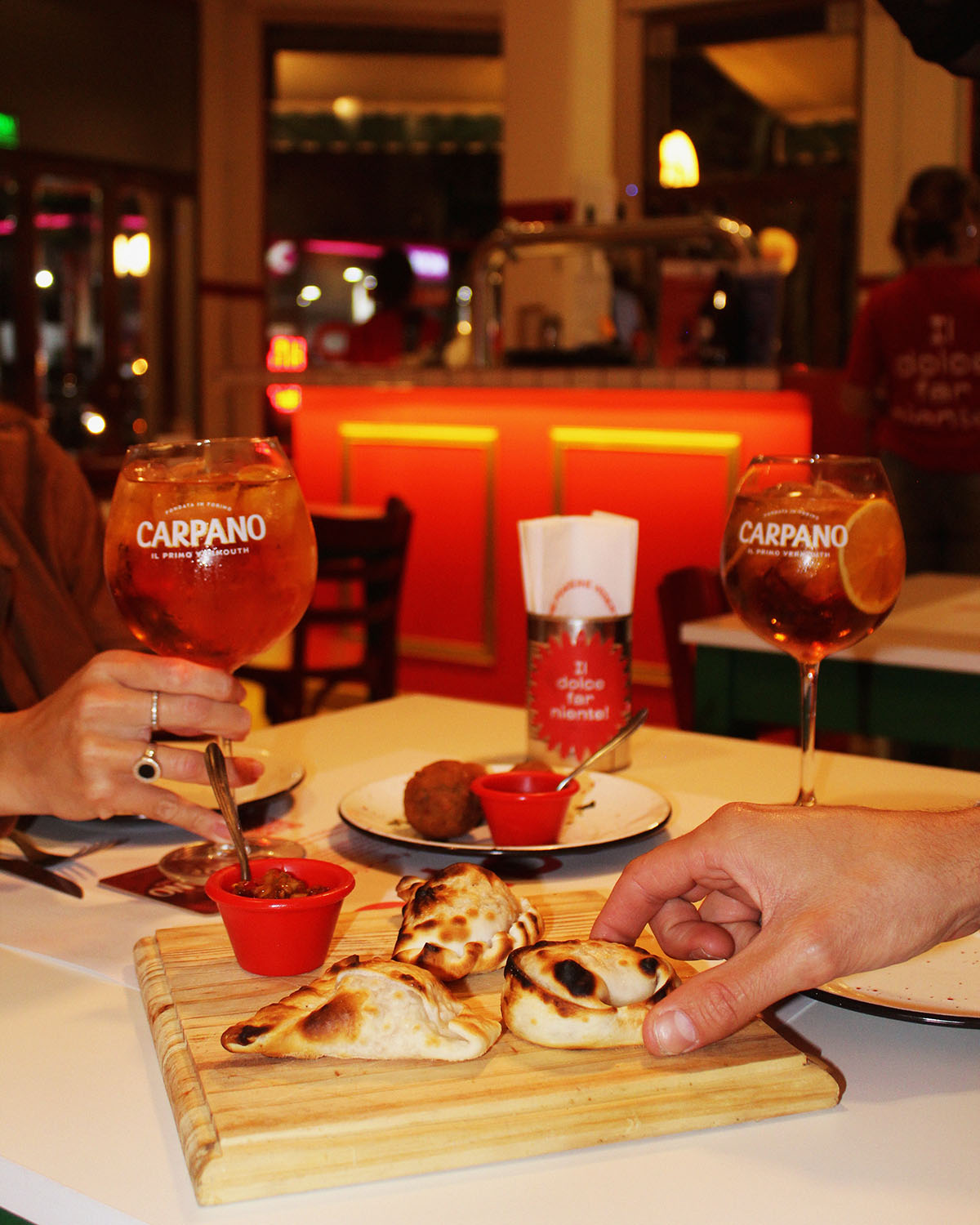 Y si sos de quienes prefieren sabores más criollos, hay variedad de empanadas y ensaladas; «ofrecemos diferentes platos que integran la cultura italiana con la argentina y también en las bebidas que encuentran vino, birra artigianale, cocteles y bebidas sin alcohol».