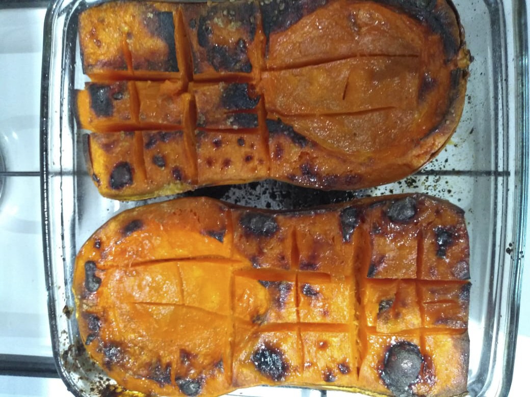 Cocinar una calabaza al horno, previamente colocarle sal, azúcar y aceite.