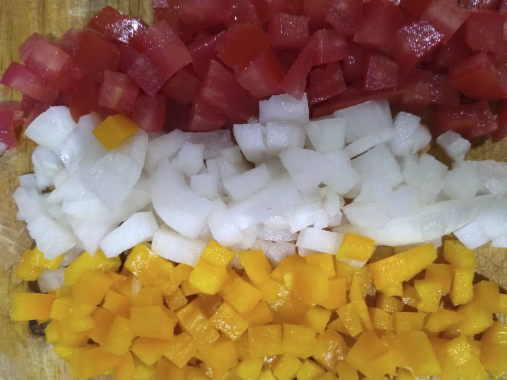 Cortar los vegetales en bronoise (cubos pequeños para el salteado)