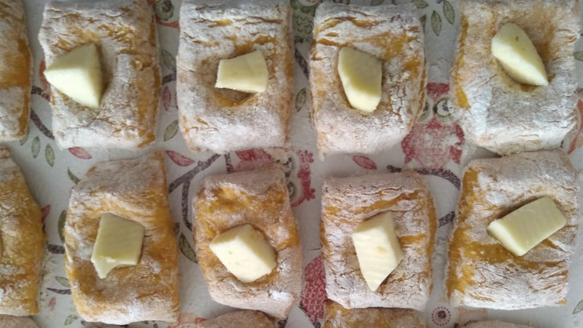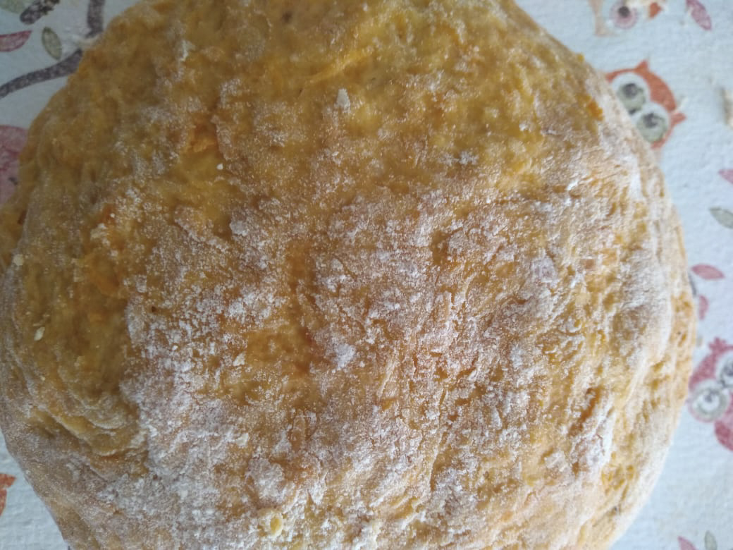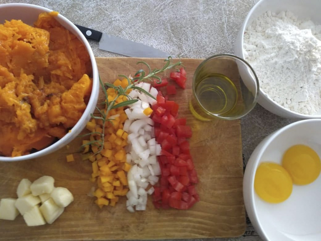 Ingredientes: Calabaza cocinada 800grs/ harina 200grs / 1 yema / sal 10grs / azúcar 30 grs / aceite (si es oliva mejor) / 2 tomates / 1 cebolla / 1/2 pimiento / queso 100grs.