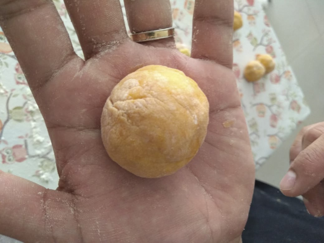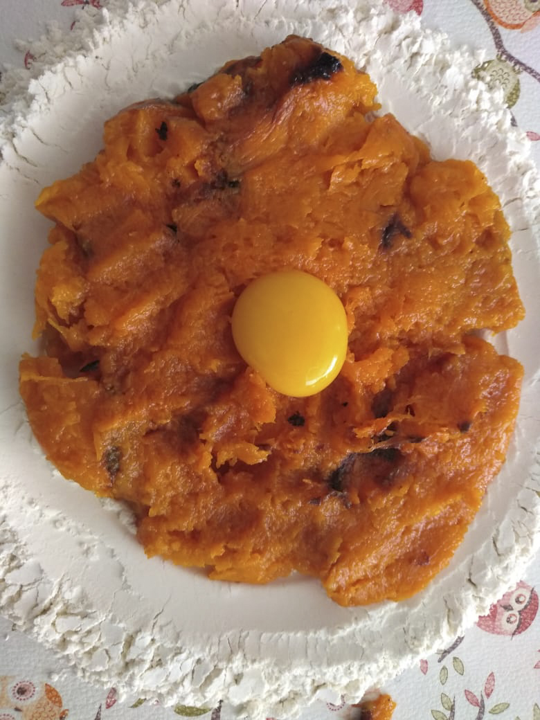 Sacar el puré de las calabazas y empezar a armar la masa mezclando el puré con los huevos y la harina.