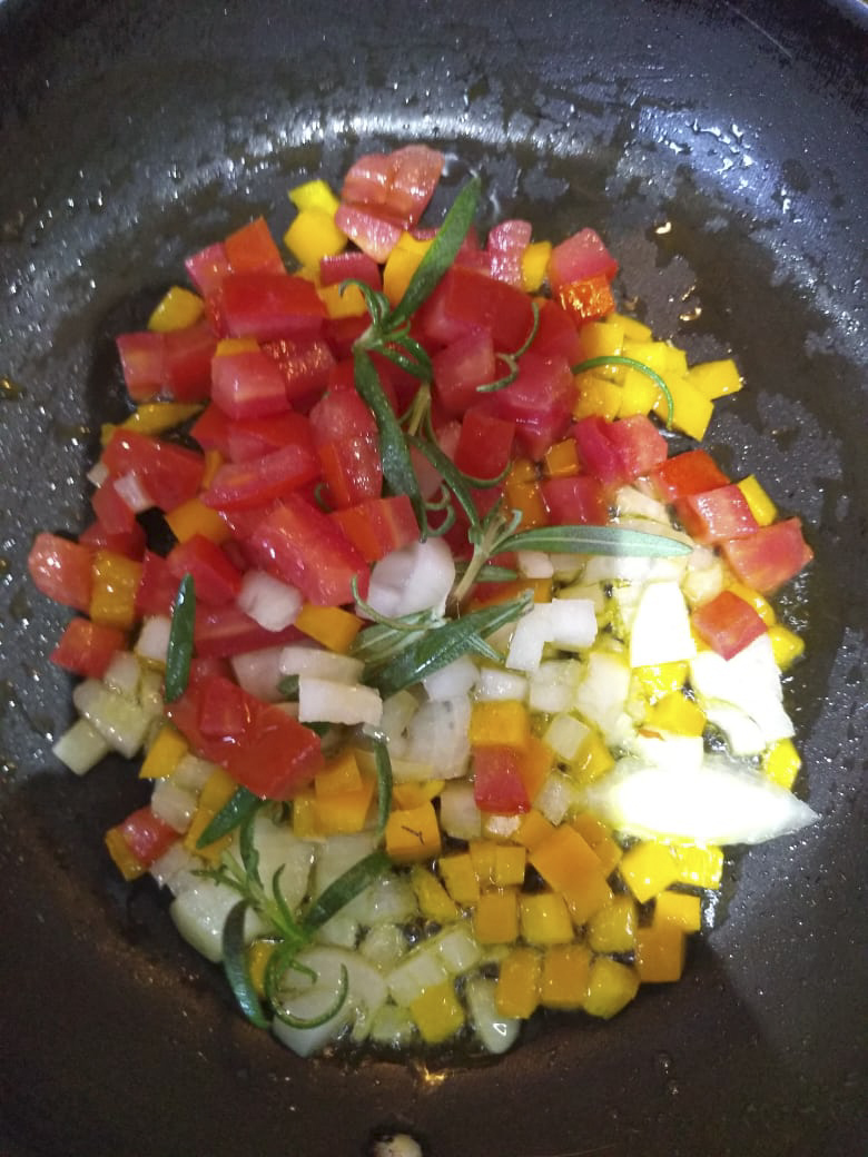 Llevar al agua hirviendo con un poco de aceite y sal. Mientras los ñoquis se cocinan saltear los vegetales. Agregar al salteado los ñoquis y servir.
