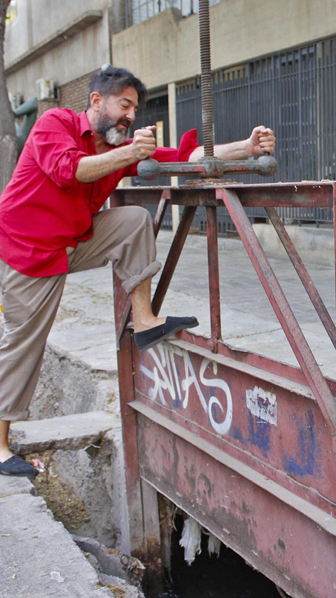 En perspectiva con la obra, una gran compuerta de Irrigación nos llama la atención. Osvaldo se entusiasma contando que el mítico Tajamar pasa exactamente por debajo de su casa. Podemos sentir el sonido del agua, algo que para él es parte del encanto de vivir allí. Nos invita a pasar. Desde adentro la obra también se aprecia. Un desnivel arquitectónico ha sido necesario en la sala principal para que las aguas del canal fluyan por debajo. Como escalones Osvaldo ha puesto los fabulosos libros de contabilidad de la antigua bodega Escorihuela. En ellos su obra avanza. Son los mismos que podemos apreciar en Casa Vigil Chachingo donde también sus dibujos embellecen estos tomos centenarios.