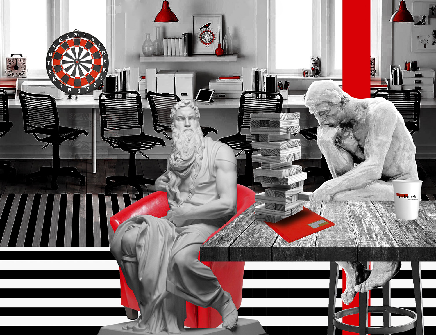Uno de sus últimos trabajos se puede ver Redcouch, un espacio de coworking ubicado en Torre Emilia, donde fue contactado para llevar adelante este trabajo. Se trata de una serie de collages inspirados en la mitología griega que funcionan a modo de murales a lo largo de todo el edificio. «La Avenida Emilio Civit se caracteriza por ser una calle llena de casas con grandes columnas, esculturas, mansiones, embajadas, edificios antiguos…mucho clasicismo en general. A mí siempre me interesó leer sobre historia del arte griego, y uniendo todo esto hice mi propuesta y les gustó», cuenta el diseñador.