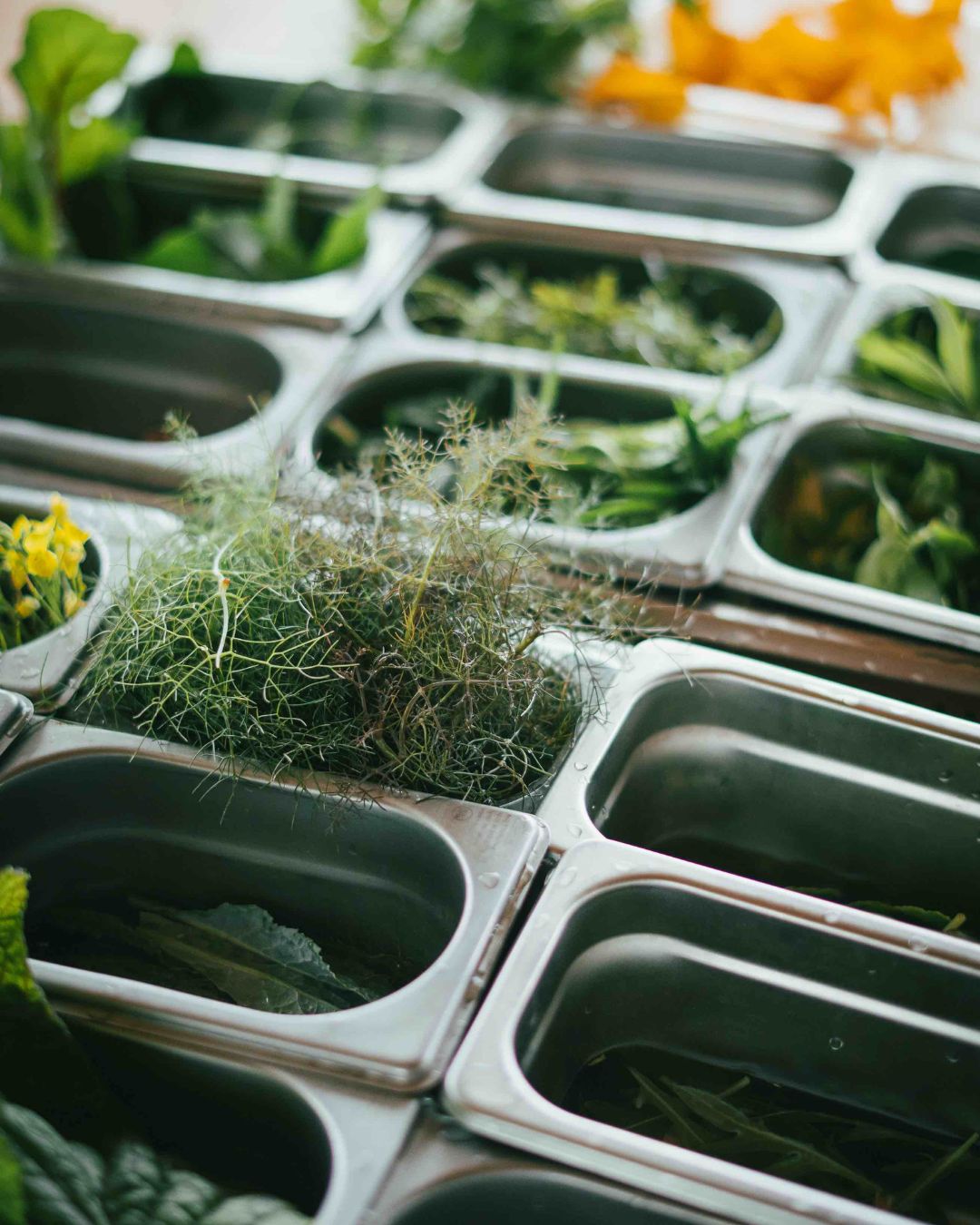 Hinojo “bronce y silvestre cosechado de la acequia”, hojas de espinaca, melisa, albahacas limón y aní, hojitas de manzanilla, matico, tropaeolum “o lo que la abuela llamaría taco de reina”, hojas de zanahoria, hojas de menta “para refrescar”, hojas de crisantemo, flores de apio, hojas de verdolaga “es rica y carnosa”.