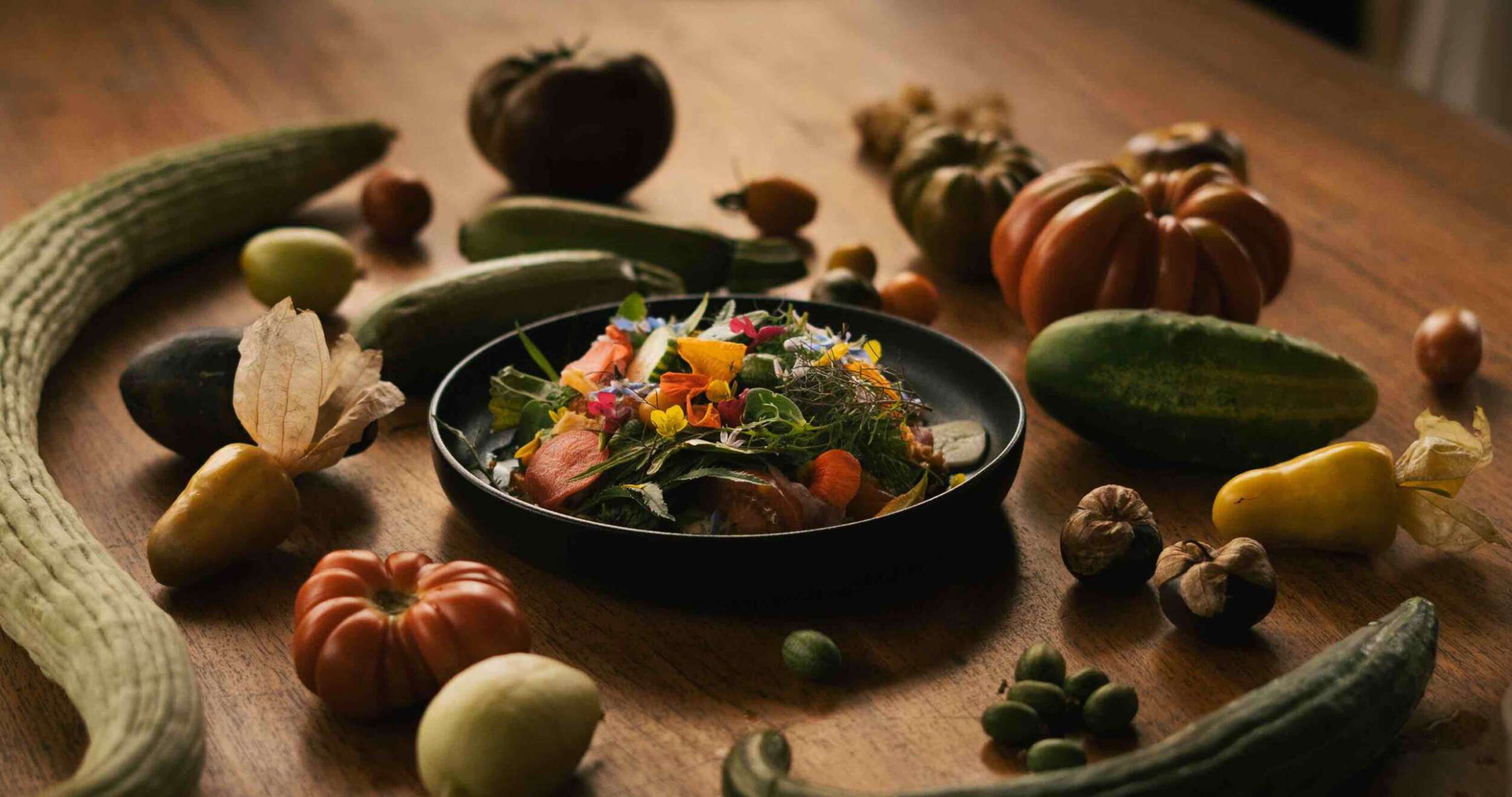Además, damascos caramelizados; variedad de pepinos (blanco, amarillo, cucamelón); pasta de ají amarillo “para darle un picor”; salsa bearnesa; fisalis, “es familia del tomate”; kimchi “para dar acidez”; pickles de rabanitos; pétalos de flor de zucchini y flores de ciboulete, trapeolum, borraja, mostaza silvestre y de salvia.