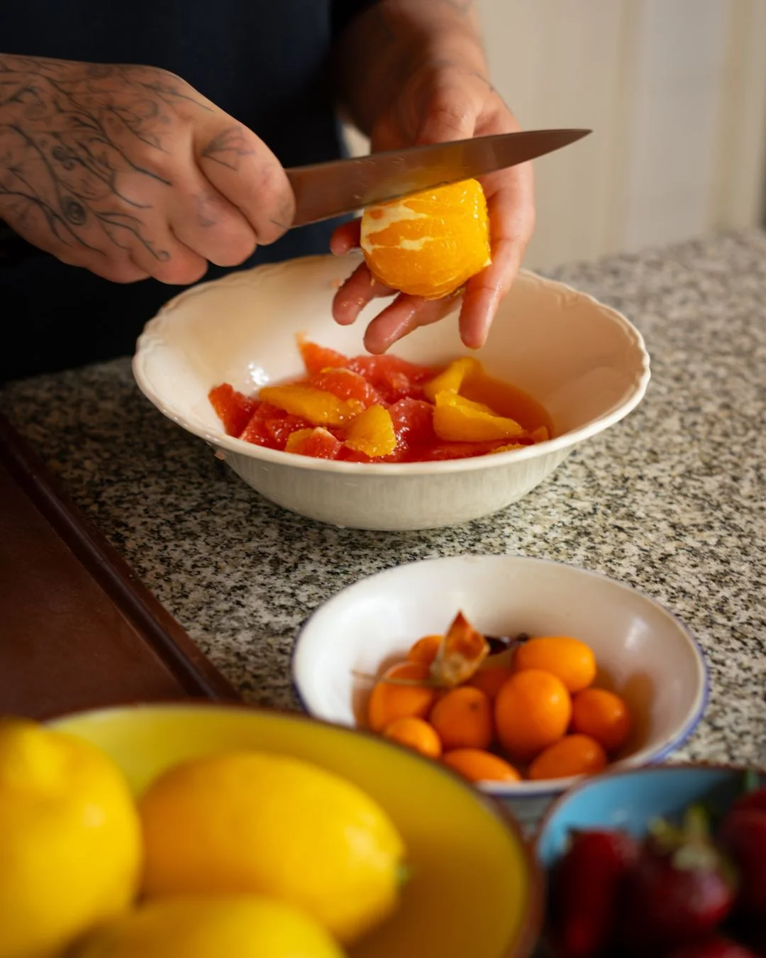 - Cortá todas las frutas en juliana o láminas finas.