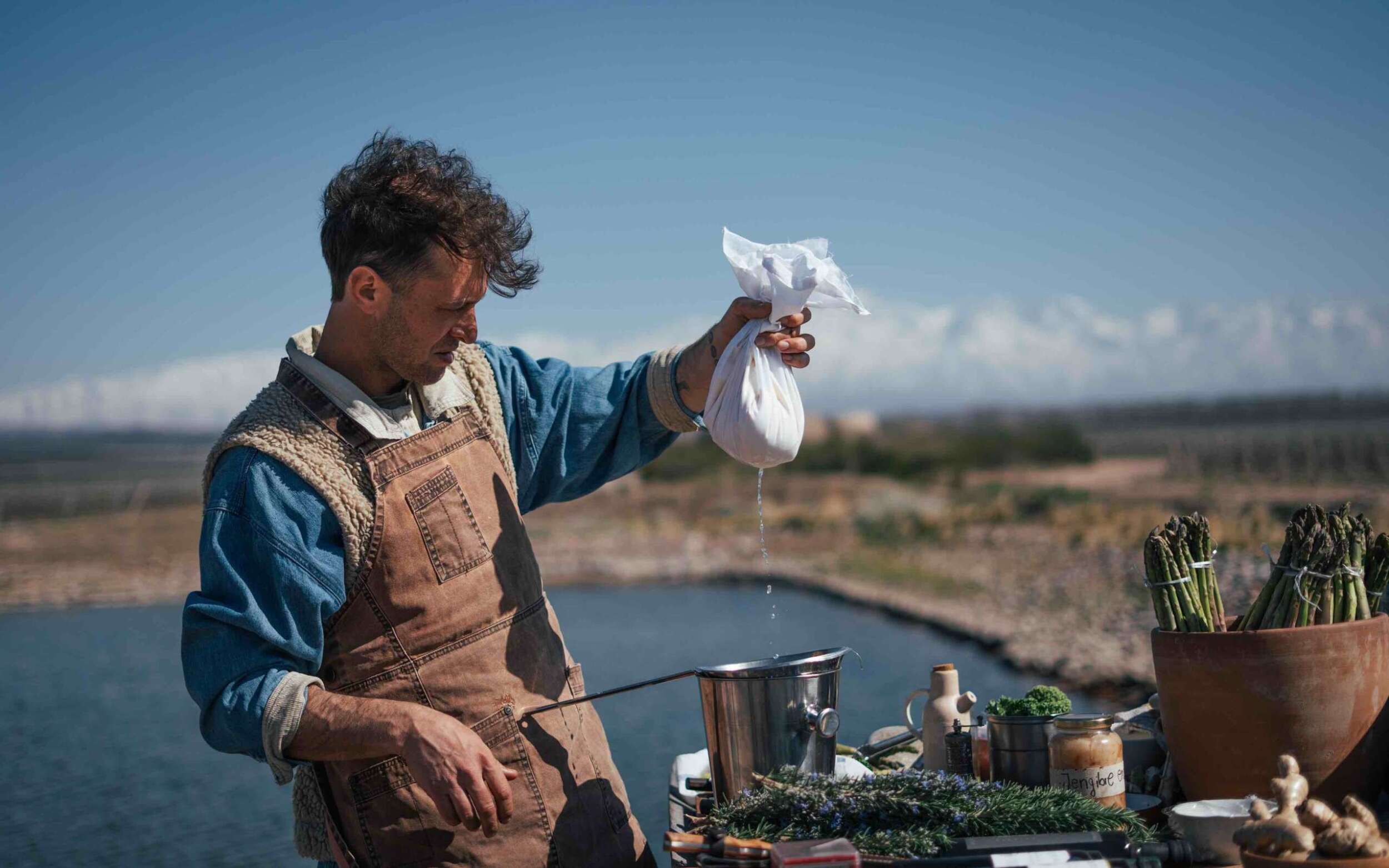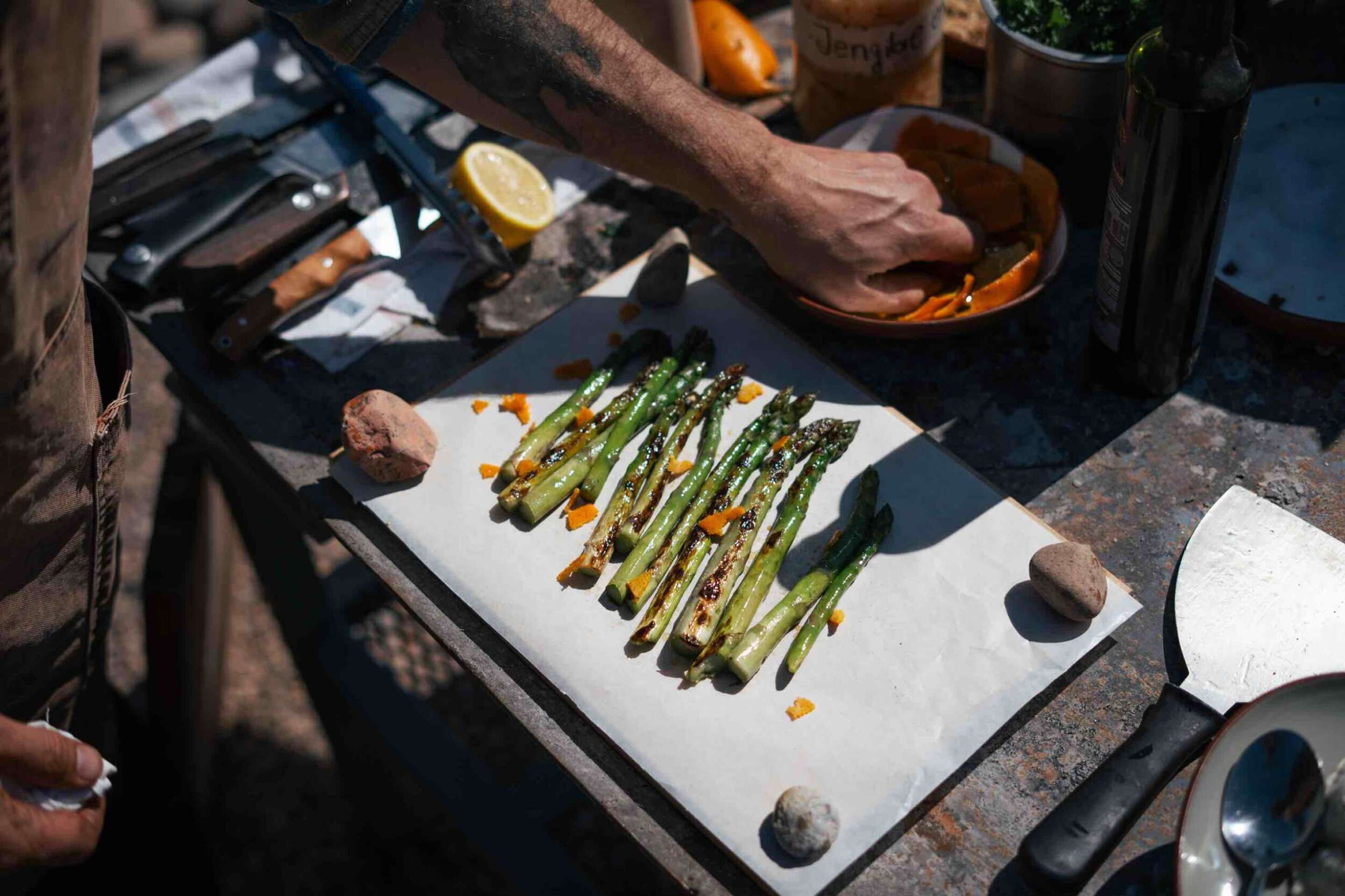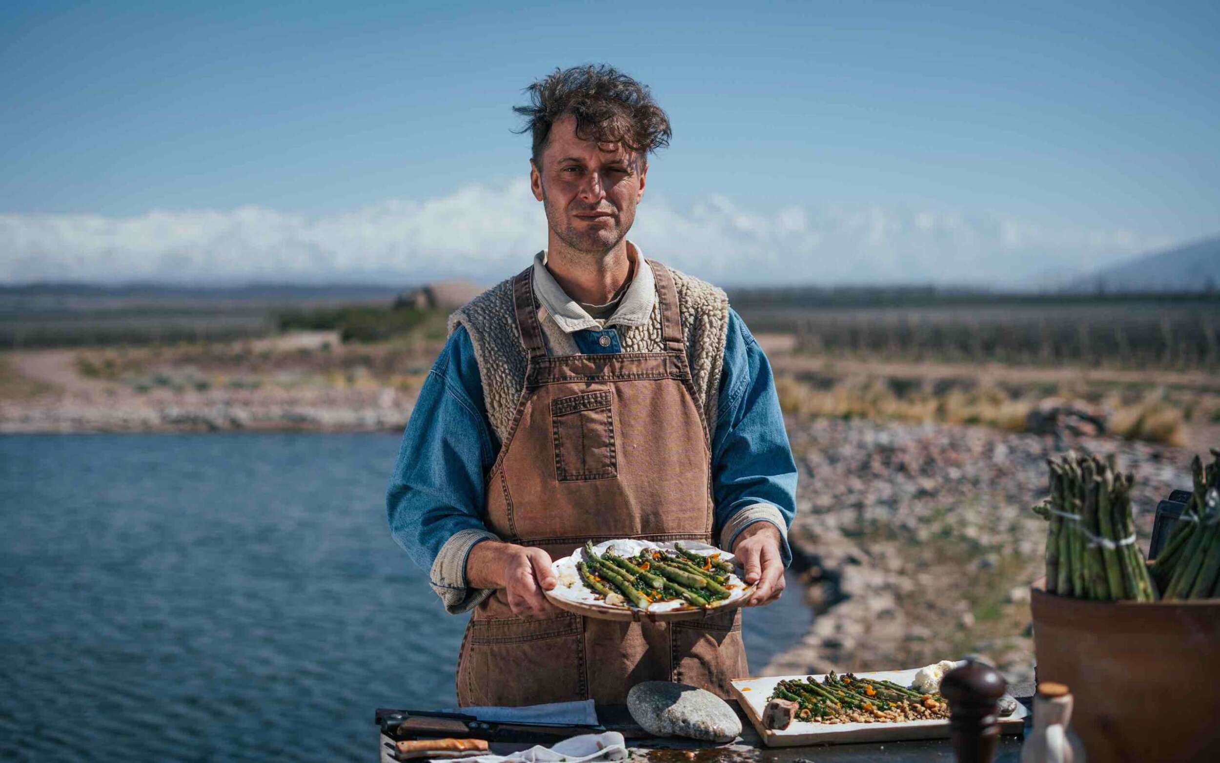 La temporada de espárragos es ahora y los producidos en San Carlos brillan como los mejores del país. Diego propone hacerlos de maneras diferentes pero partiendo desde un mismo punto: blanqueados en agua de mar; a partir de ahí explora dos caminos: uno más clásico, con impronta italiana; y el otro, más atrevido, con guiños asiáticos.