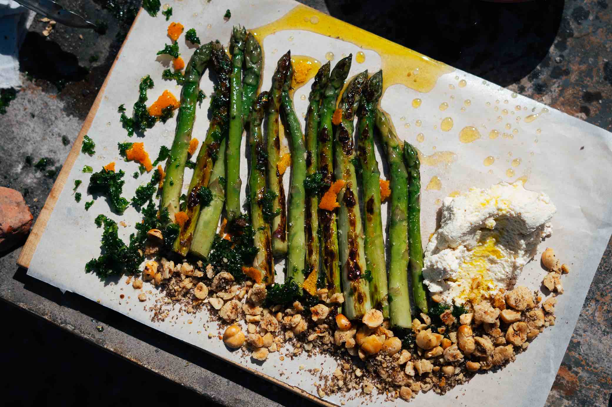 Disponer los espárragos en el plato, “pueden pasar por alguna chapa o sartén unos minutos antes de emplatar”. Agregar la ricota casera en cucharadas. Incorporar arena de avellanas, piel de naranja en tiras, un hilo de aceite de oliva y unas gotas de jugo de limón. Finalizar con sal de mar.