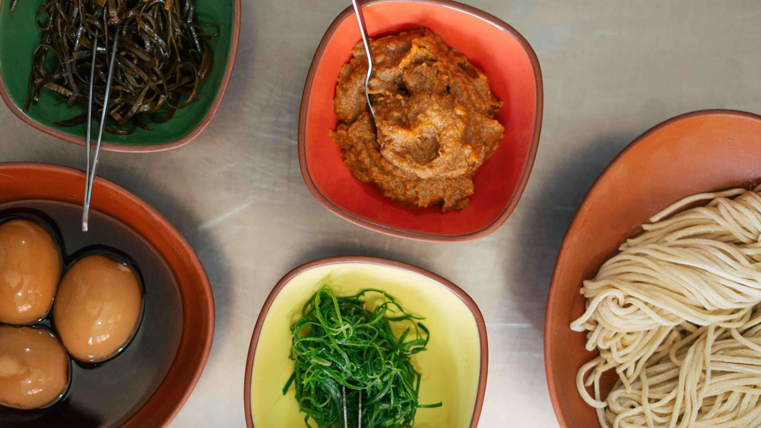 En el ramen de Oye, los fideos alcalinos son de elaboración propia y artesanal. Se cocinan en agua hirviendo hasta que estén al dente, se escurren y se reservan para el momento del emplatado.