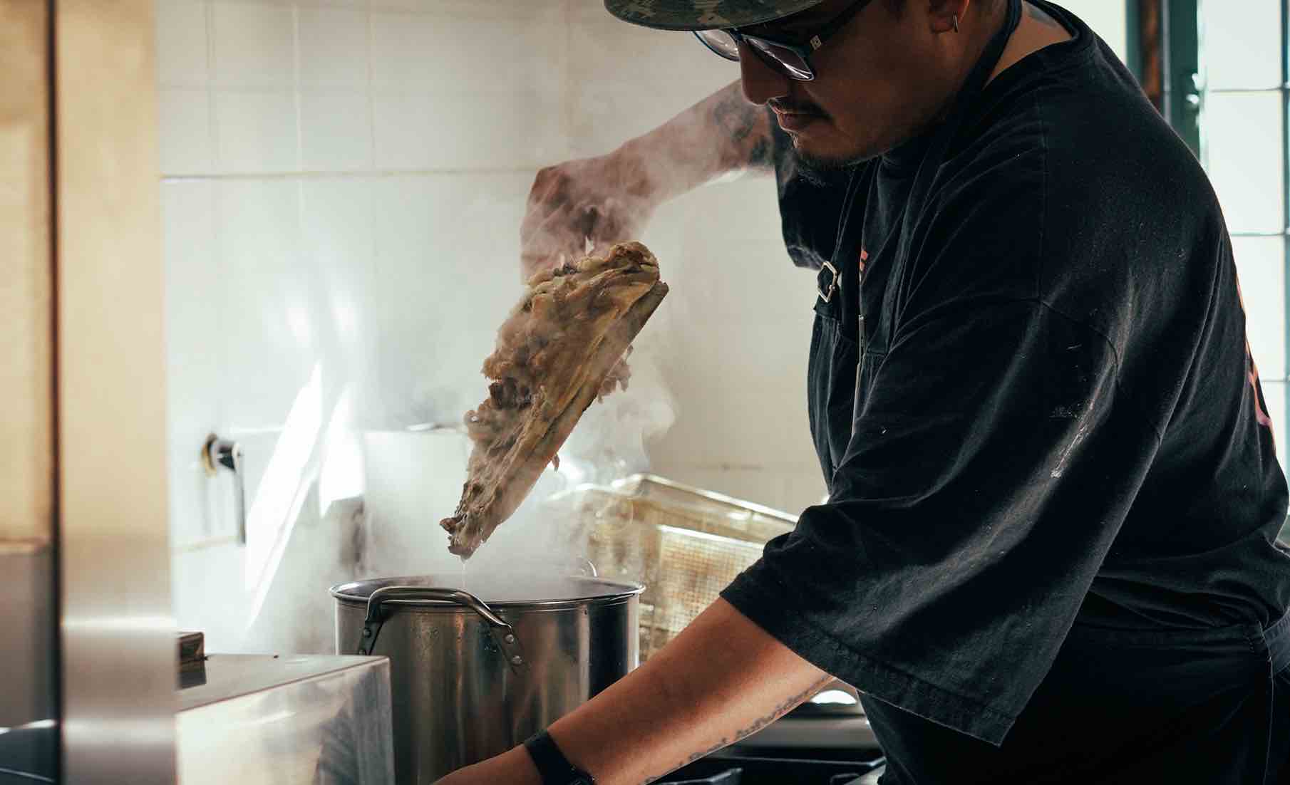 Se retiran los huesos y se los empieza a golpear vigorosamente para ayudar a liberar la mayor cantidad de colágeno posible en el agua, «esto le da textura, color, sabor y riqueza al caldo». Repetir este paso cada 1 hora, hasta llegar a las 8 horas de cocción. «Cuando se deshace el cerdo, se licúa y se filtra para que no quede ninguna impureza». Así, el caldo tonkotsu queda listo para emplatar.