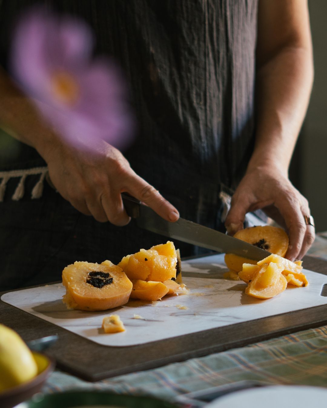 Retiramos la fruta de la olla y la cortamos; limpiamos bien el centro (guardando ese corazón con semillas y pectina en un bowl y dejándolo aparte para la jalea) y molemos la carne del membrillo para obtener el puré. “Recomiendo usar un pisa papa o la moledora de carne para obtener un grosor justo”.