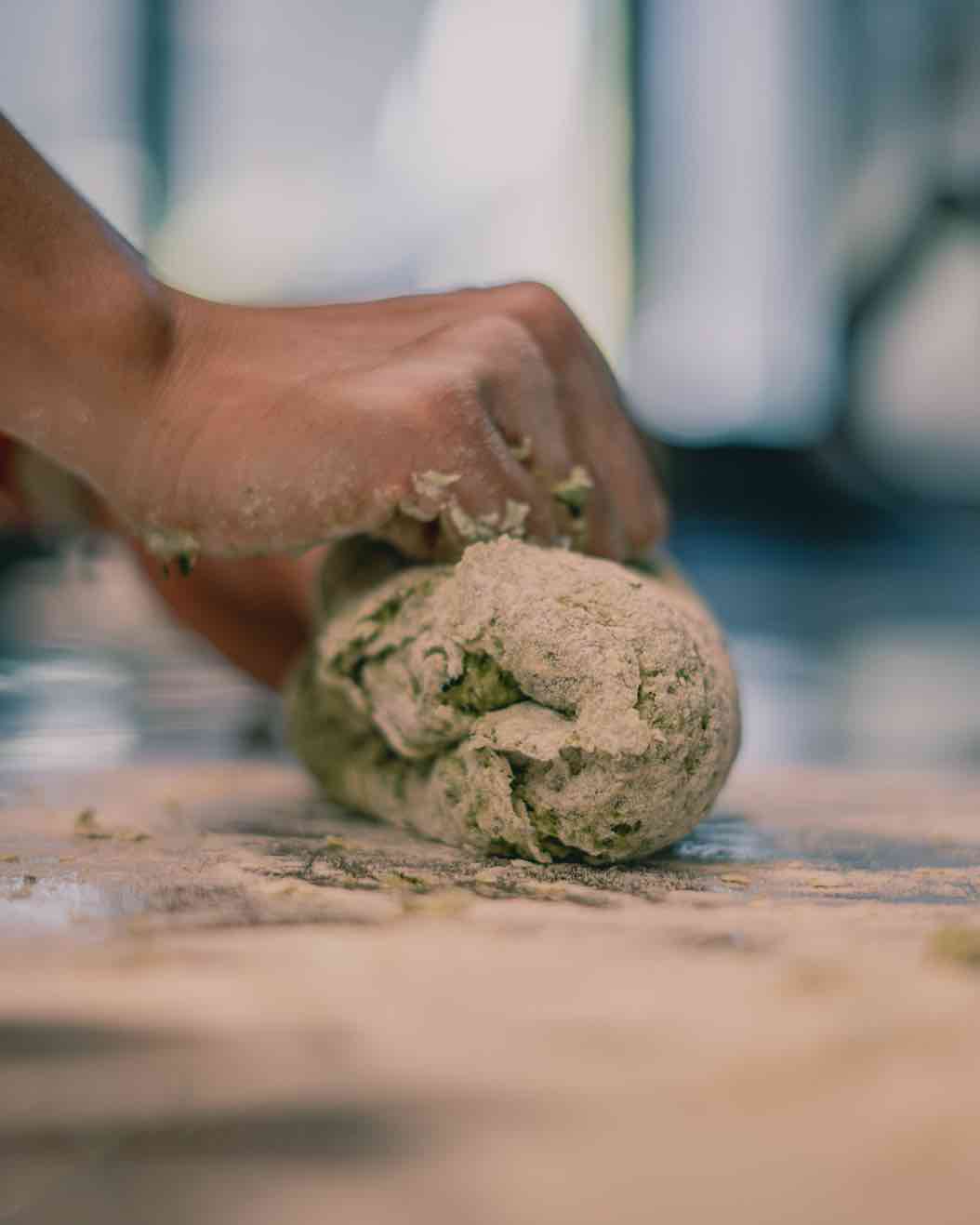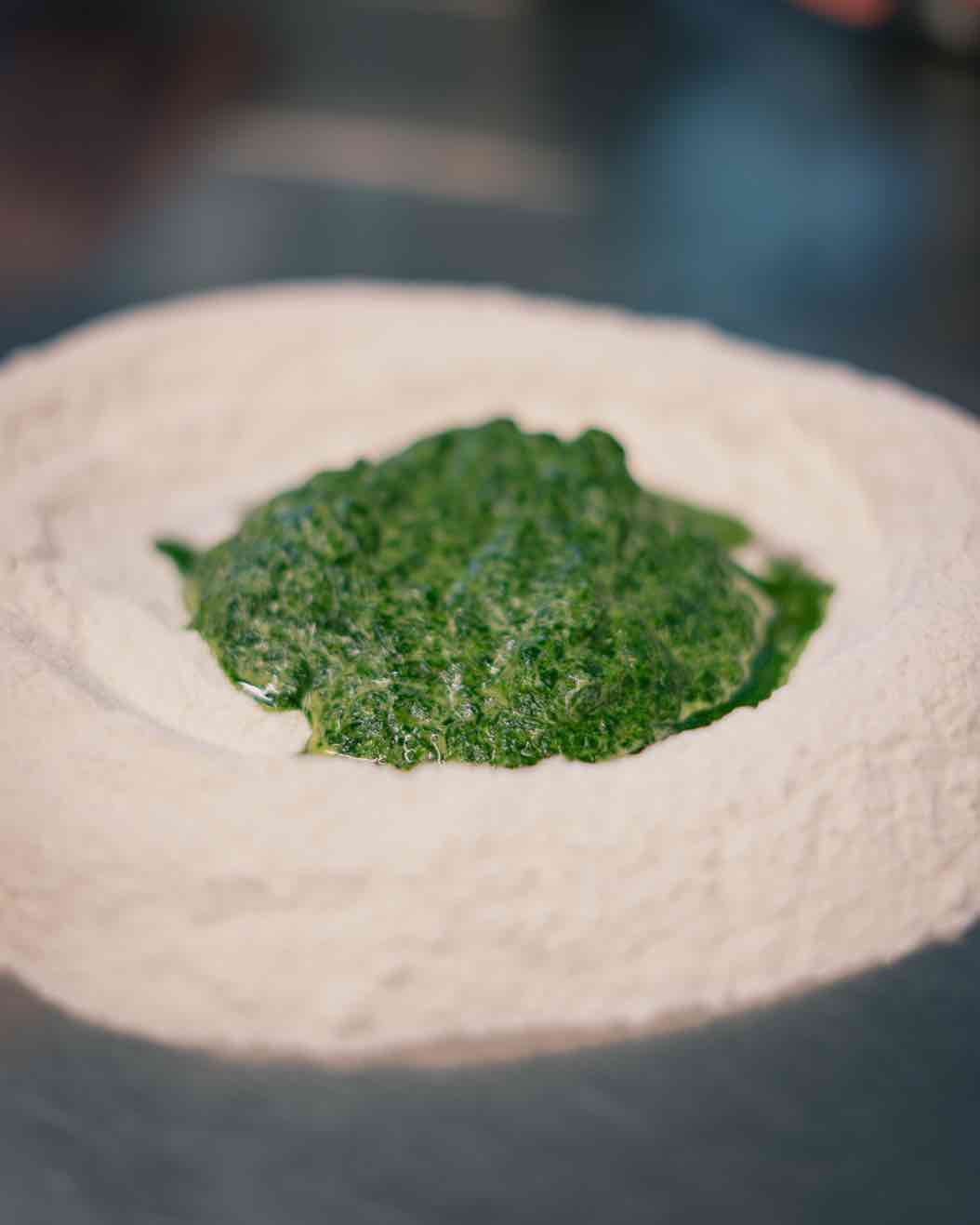 En un bowl mezclar todos los secos y luego volcar en la mesada y formar una corona, “quien prefiera, puede seguir trabajando en el bowl”. Incorporar el resto de las yemas, aceite de oliva -“todo es mejor con oliva”- y la espinaca procesada; tomar de a poco todos los ingredientes hasta formar un bollo.