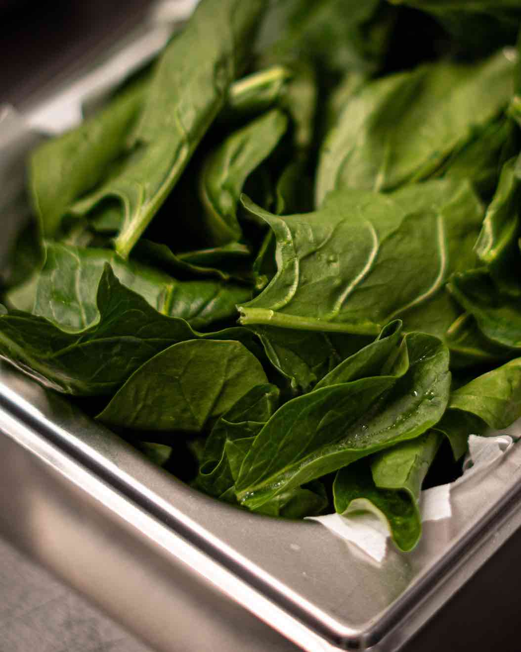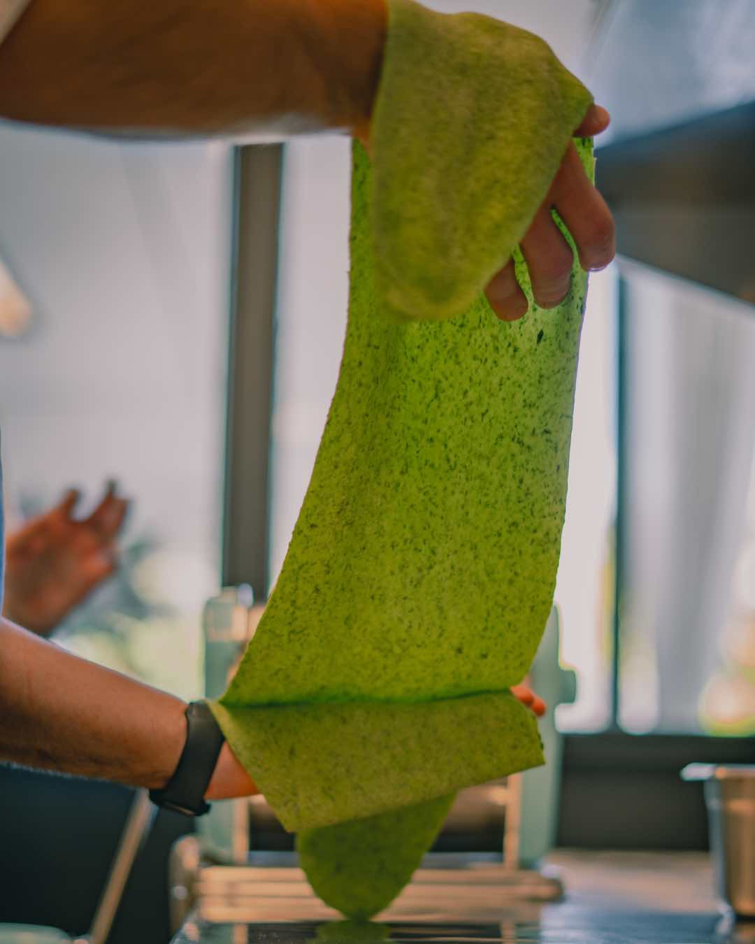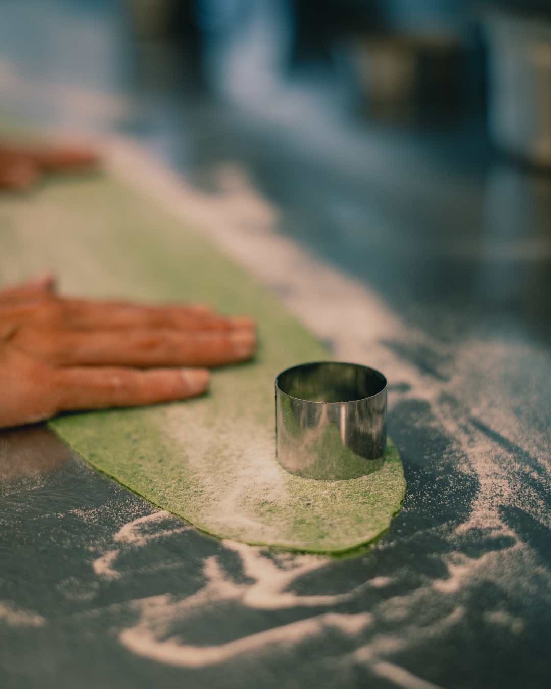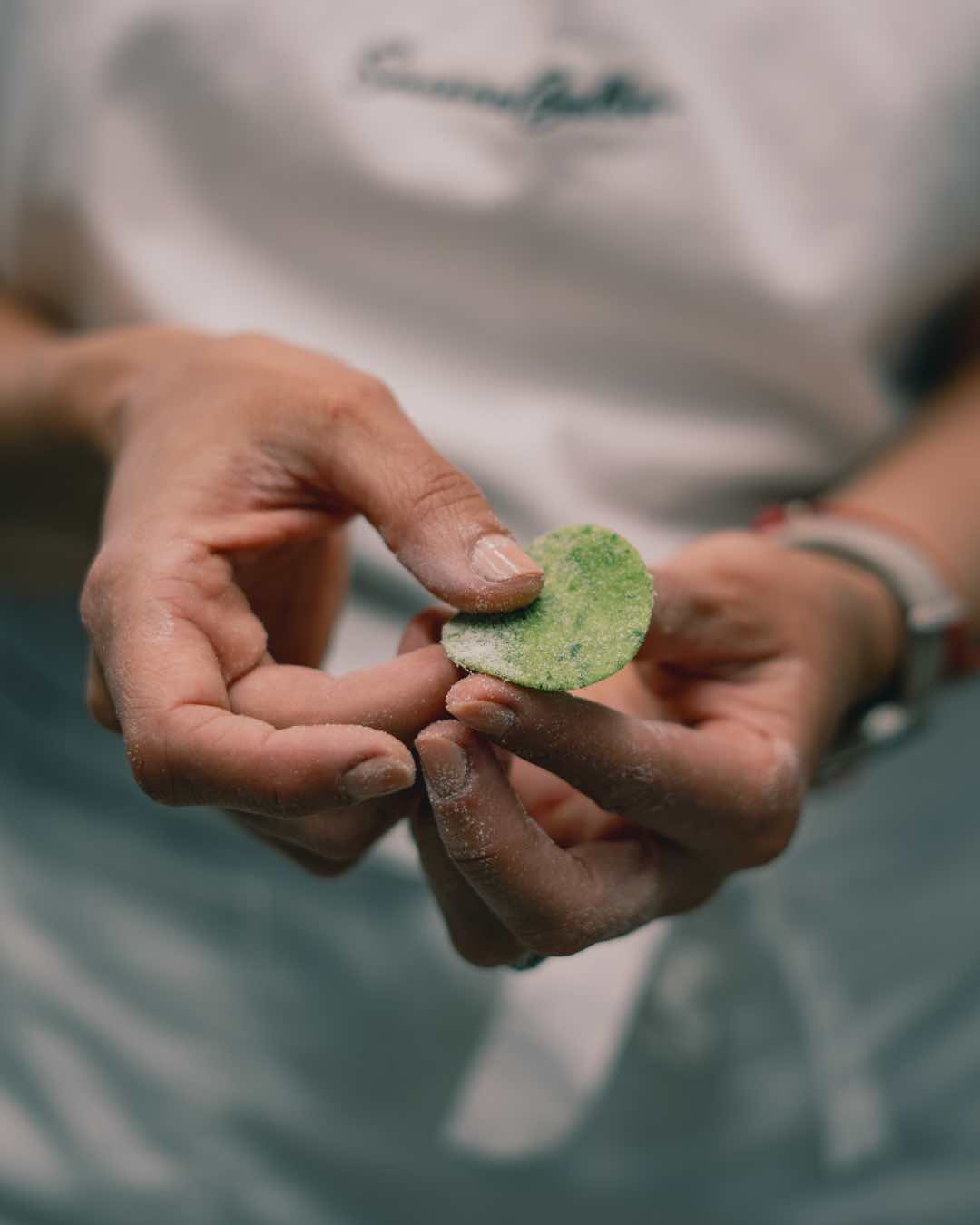 Masa de pasta verde: rosetas de espinaca: En una olla colocar agua a hervir con una pizca de bicarbonato para blanquear la espinaca. Tener un recipiente con agua y hielo para cortar la cocción, “es el baño maría invertido, lo que se busca es agarrar la clorofila del vegetal para usarla como tinte natural de la masa”.