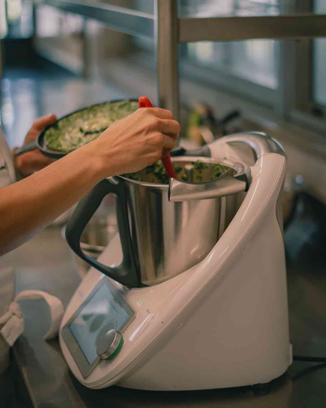 Escurrir bien la espinaca y colocarla en el vaso de la licuadora o procesadora con 4 yemas, el aceite y la sal. “Se busca obtener una crema hidratada que será parte de la hidratación de la masa, no necesito que quede una textura lisa y homogénea”.