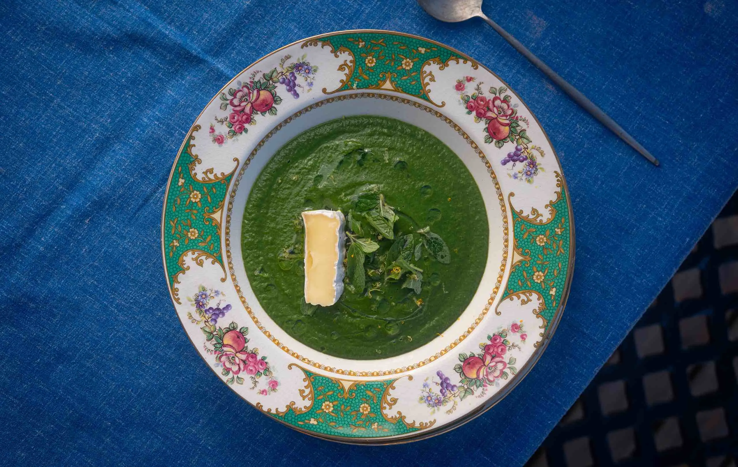 Servir en un plato hondo con menta fresca y una buena tajada de queso brie. «Me gusta mucho como le queda el queso brie. Siempre la preparo con un buen caldo vegetal casero y la termino con aceite de oliva y menta fresca, para realzar su frescura».
