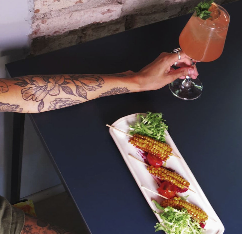 Ribs de choclo: Se trata de una porción justa de choclo en un pinche para así disfrutarlo con las manos y no terminar usando miles de servilletas. Sale de la cocina con una salsa de Sweet Chili casera, un poco picante para realzar sabores. Es un plato apto para veganos.