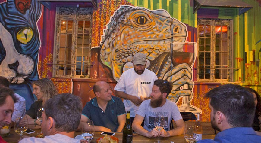 En San Lorenzo y Mitre, los murales del grupo de street art Asfáltico le dan color a la casa de tapas Zampa. Gastronomía urbana y arte callejero se conjugan y reavivan la imagen de la ciudad.