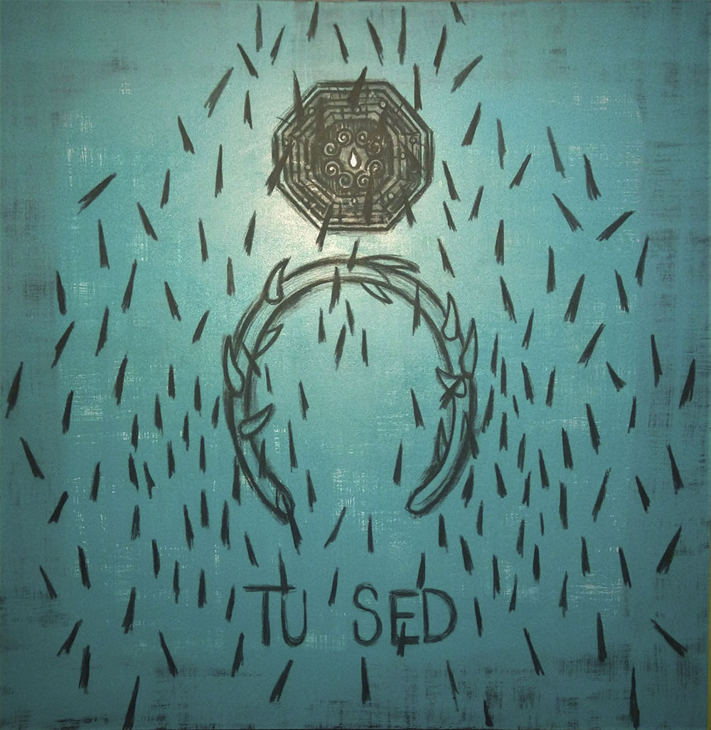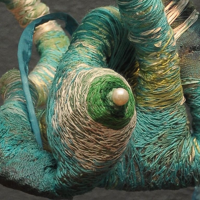 Por ejemplo Sr Enrosque, lienzo pintado, cosido y bordado sobre caucho. que representa un momento creativo, una idea. «La tengo, la pienso, le doy una vuelta. Y otra. Una más. Me derivo, se me ocurre otra cosa. Sigo pensando. Aparece algo parecido a lo del comienzo pero ya no me convence. Doy vueltas, muchas vueltas. Me pierdo, me olvido. Abandono. Vuelvo a empezar», explica Sandra.