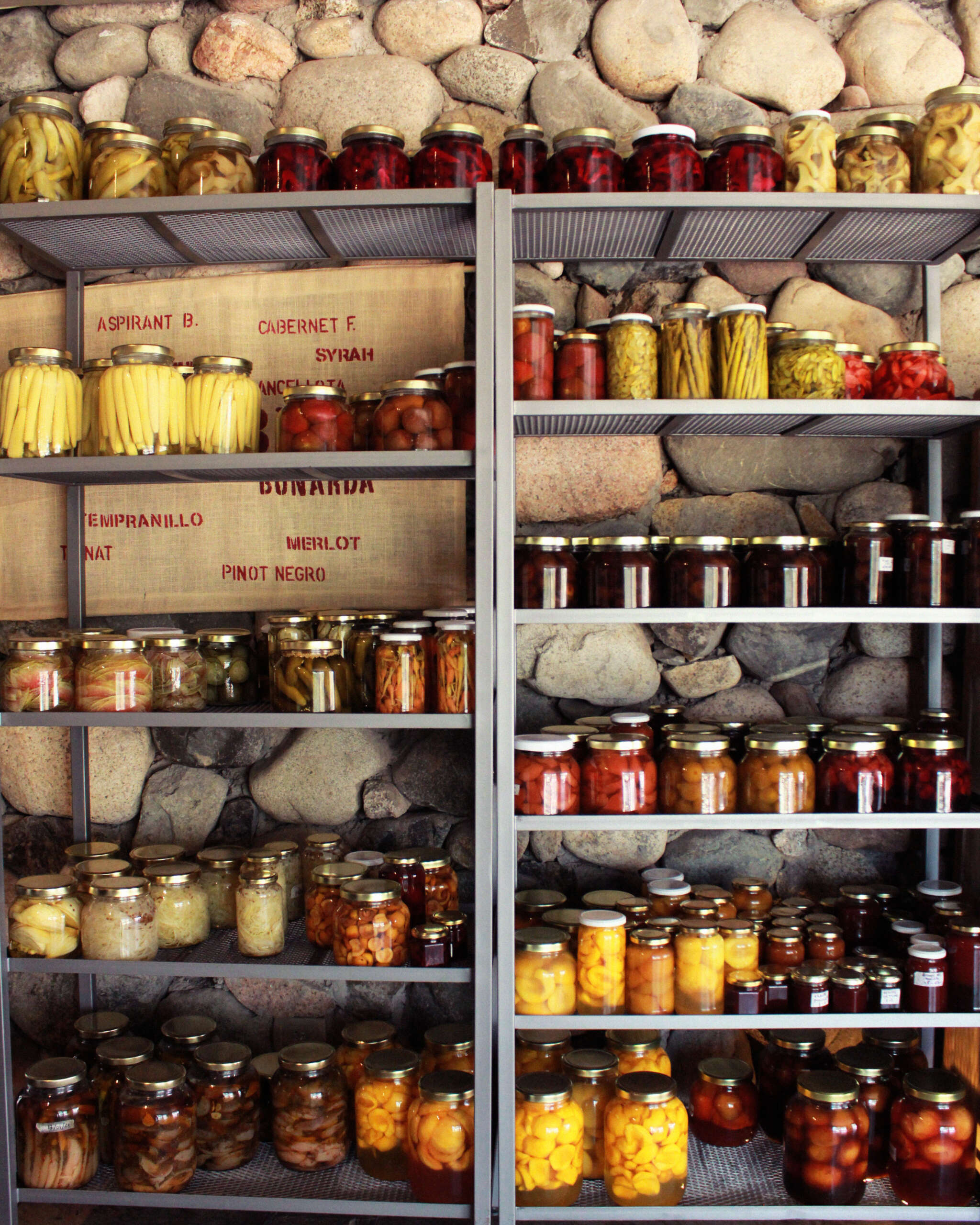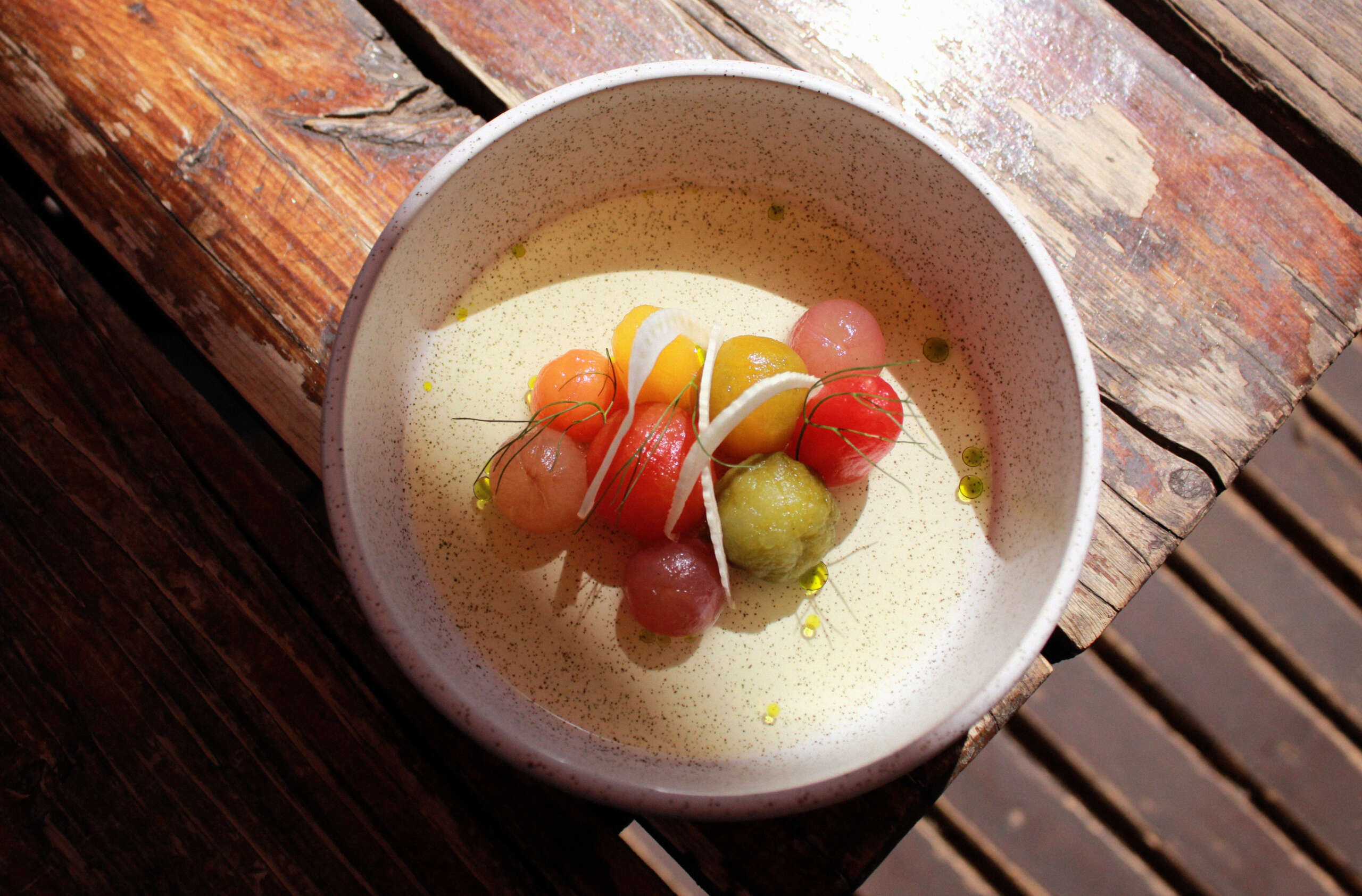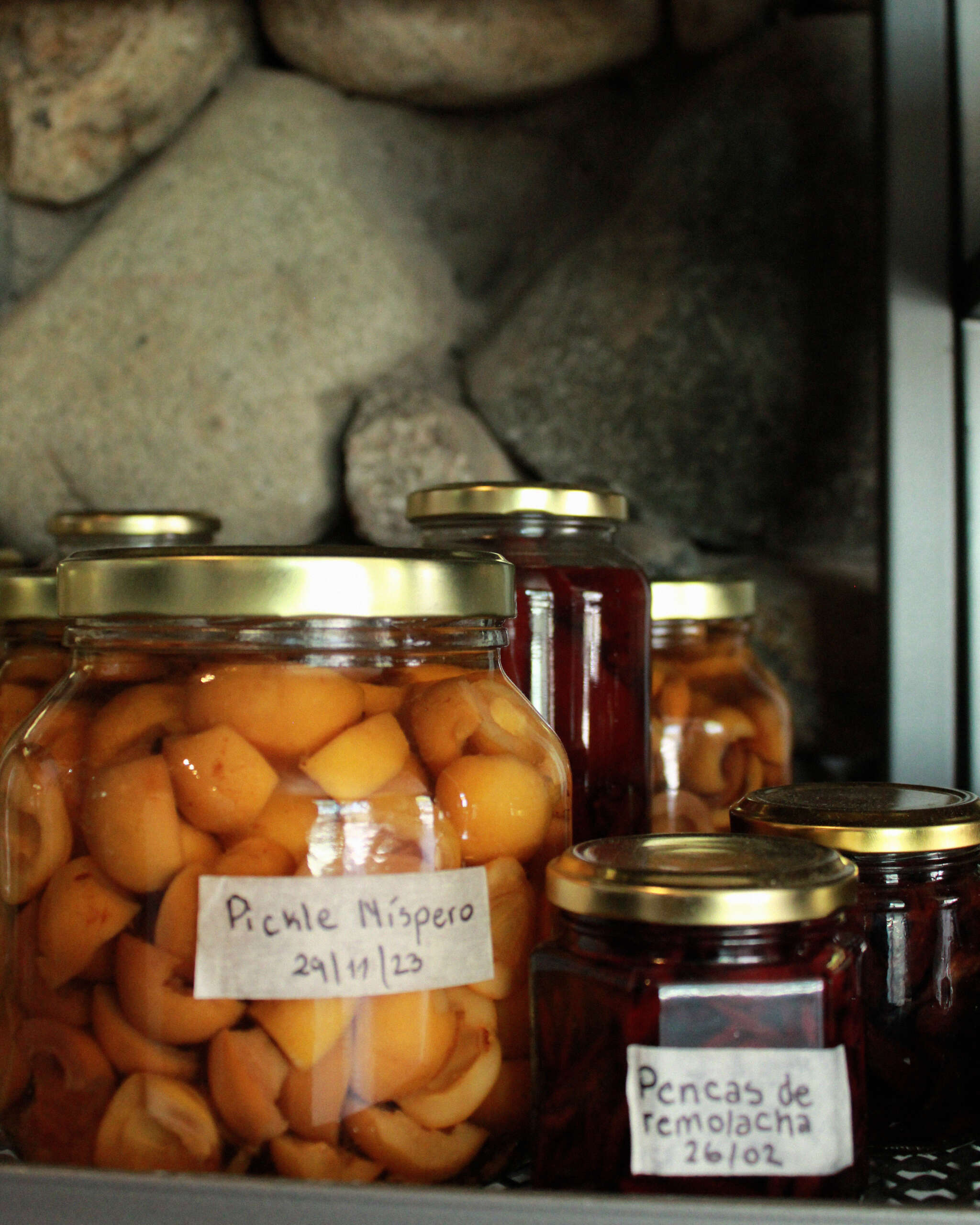 Enfocados en la gastronomía vegetal y bajo el lema “tratar de utilizar el producto cuando está fresco y preservarlo con otro perfil cuando escasea”, trabajan la materia prima de diversas formas a fin de resaltar su frescura y esplendor en temporada. Pero cuando ese producto falta, tienen la posibilidad de utilizarlos en conservas: fermentos, pickles, en almìbar o en alguna clase de untable: mermeladas, jaleas, sirachas y escabeches. Las conservas son las aliadas en muchas de sus preparaciones, y es que encontrarse en aquel lugar remoto requiere de audacia, creatividad e inventiva.
