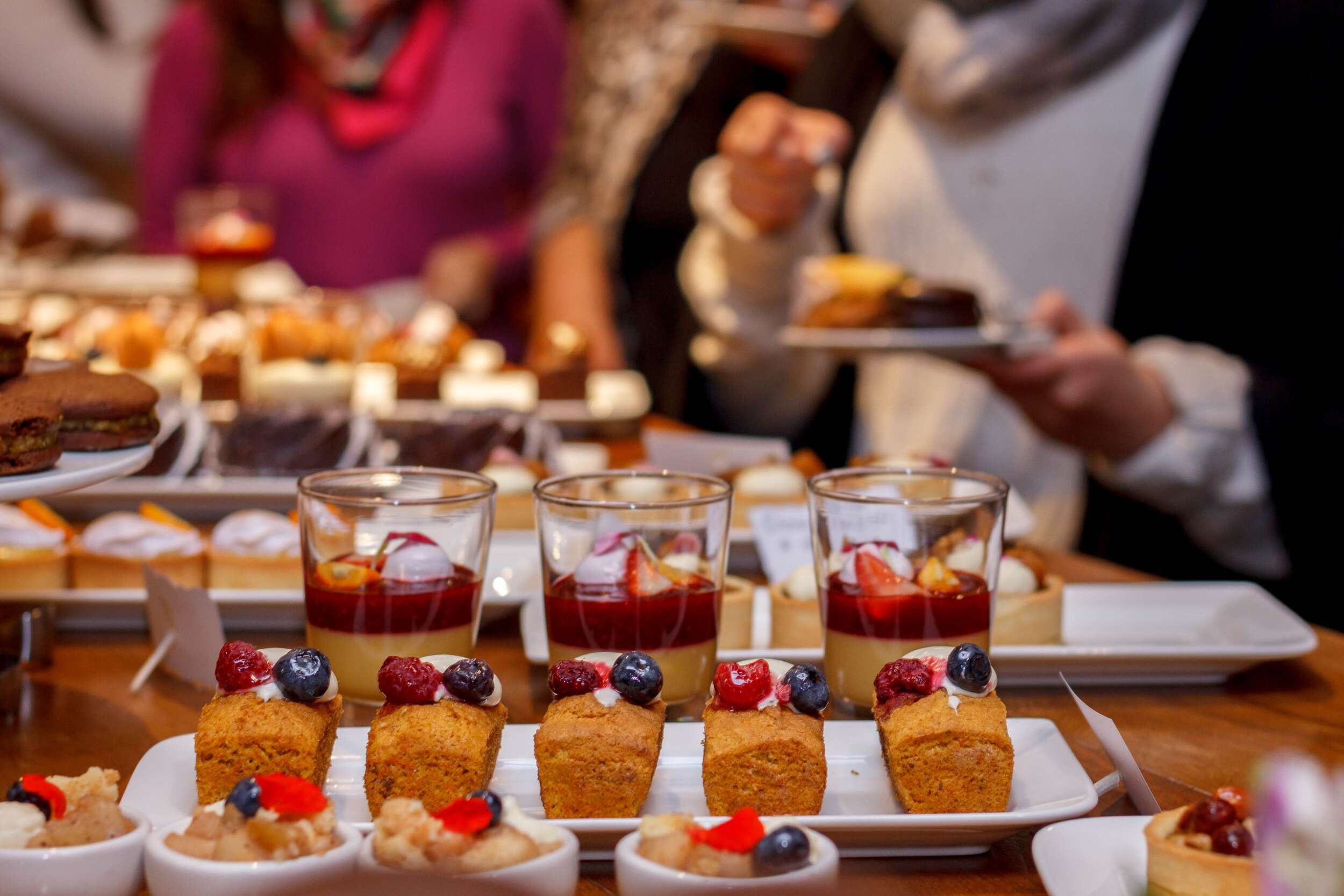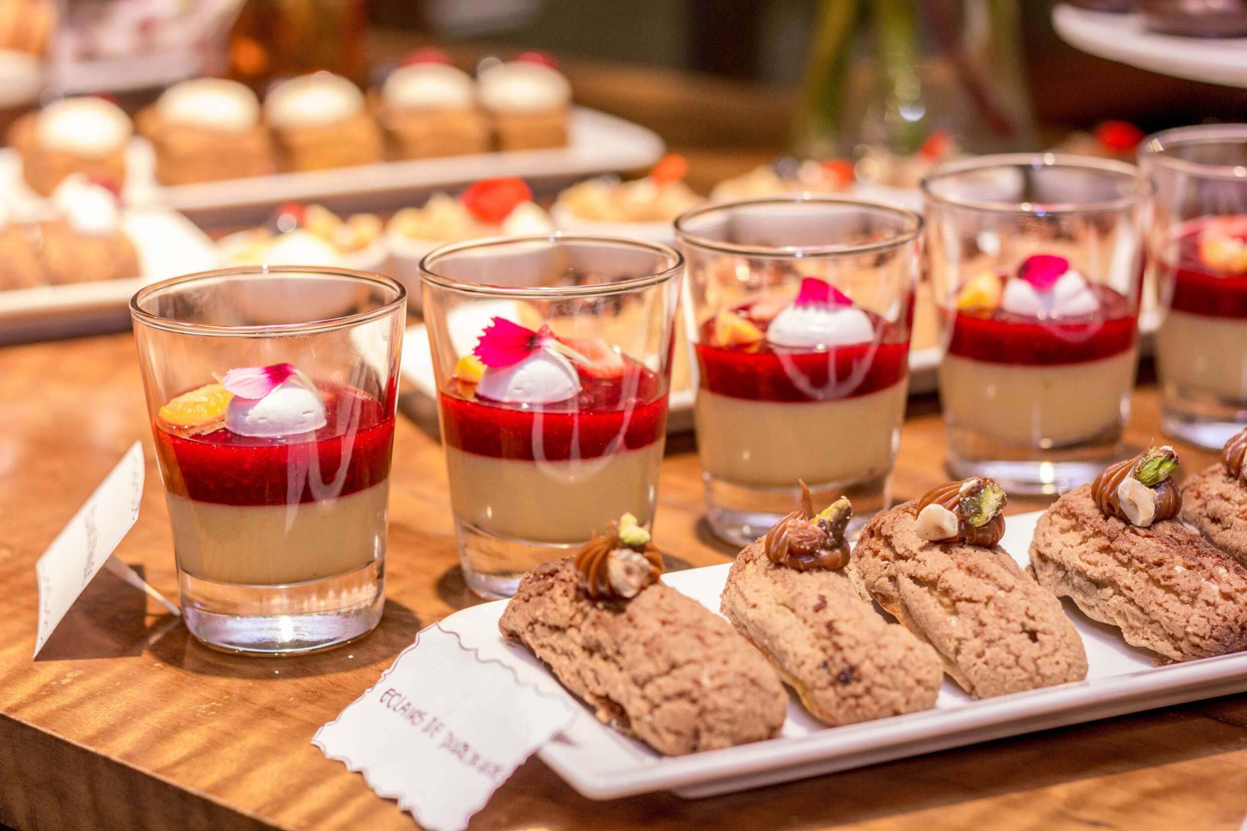 Eclair de dulce de leche o de frambuesas y chocolate con leche, crumble de manzana y pera, craquelin con ganache montada, tart brûlée de dulce de leche, lemon curd, citrus curd y frambuesas, o los cheesecake de frutos rojos, maracuyá y toffee, son ejemplos de los productos frescos que se pueden degustar ilimitadamente en el evento sabatino.