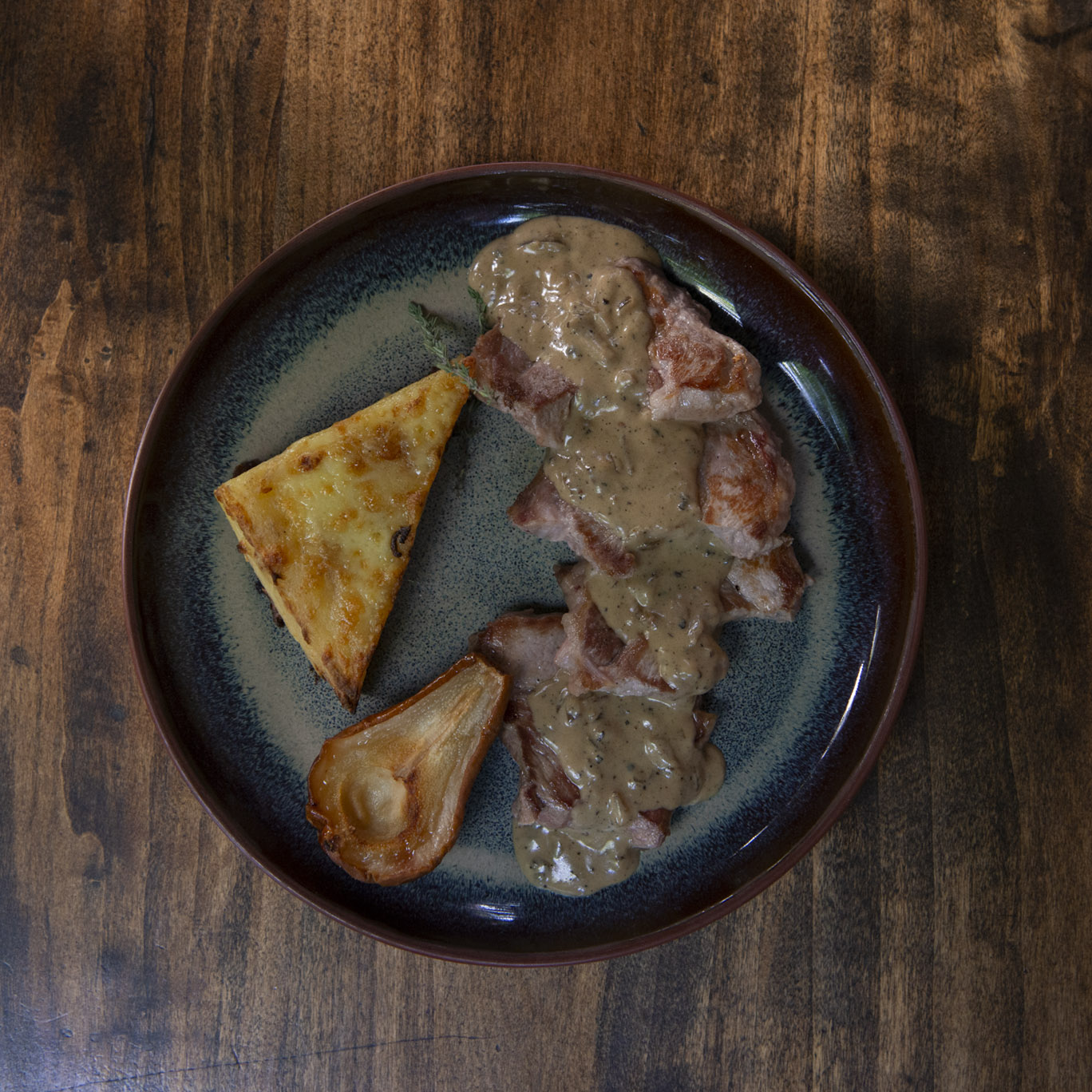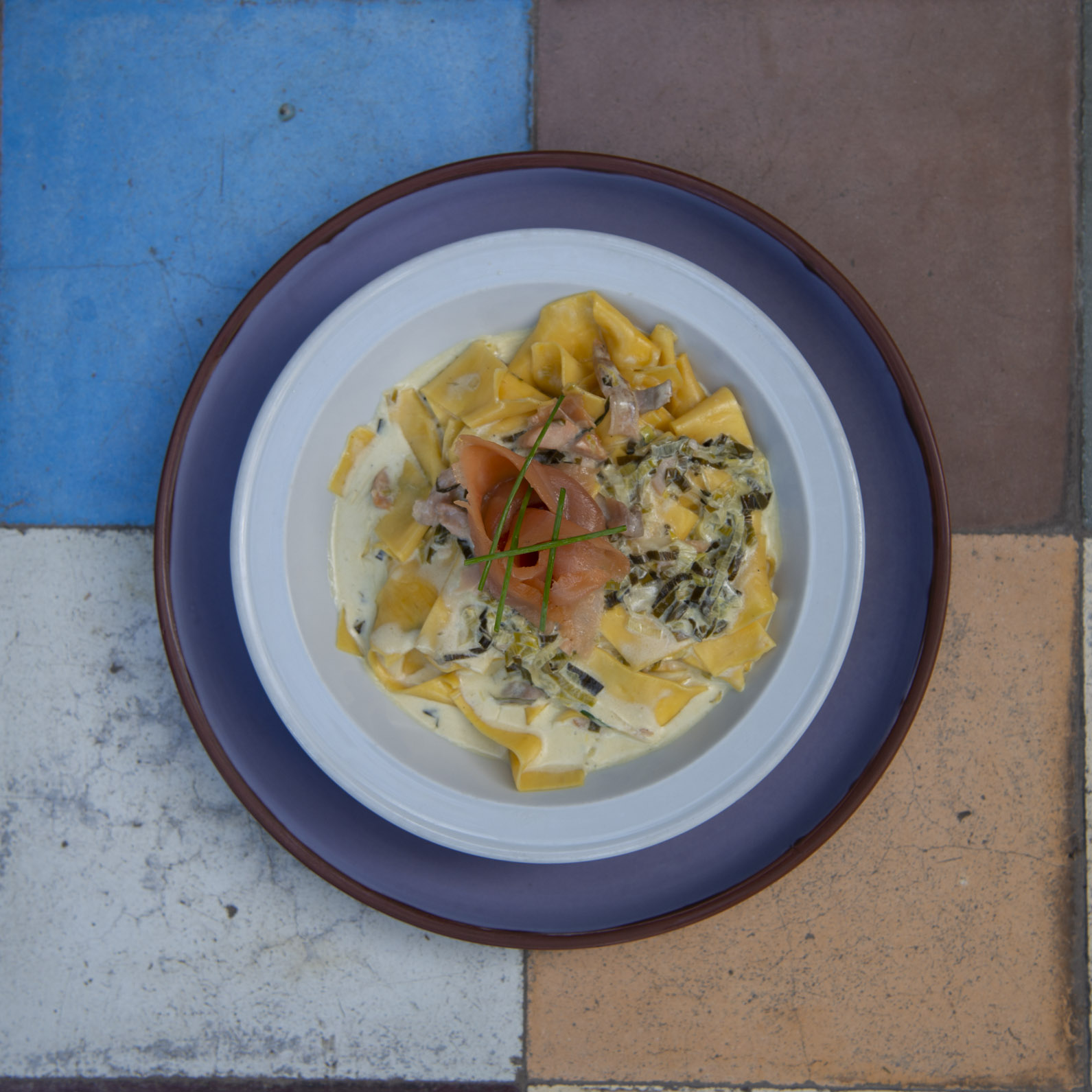 Y para el principal, eligió dos variantes. Pappardelle con salsa de crema, puerro y trozos de salmón ahumado integrado; plato terminado con una rosa de salmón y ciboulette. O, para los amantes del cerdo, una bondiola ahumada con salsa de pimienta acompañada de un milhoja de papas y pera de estación asada.