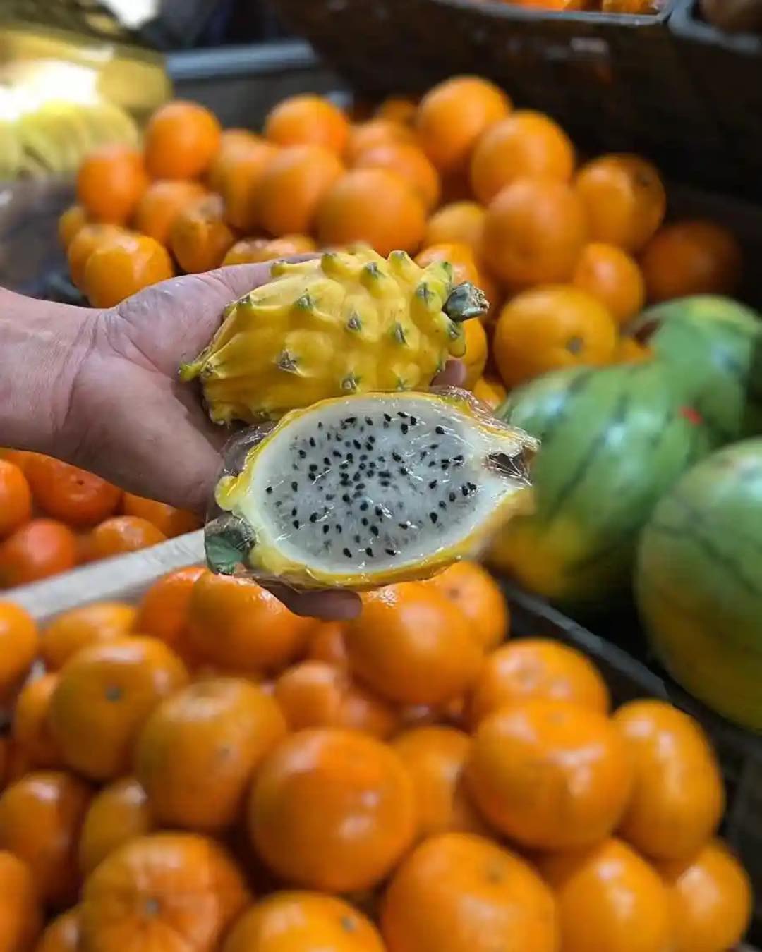En el mostrador de Frutas Nico llama la atención la pitaya o fruta del dragón conocida por su piel rosa amarilla o rosa con escamas; la exhiben cortada a la mitad para resaltar su pulpa blanca con ínfimas semillas negras que la vuelven un tanto crocante. Es sutilmente dulce y su sabor se asemeja al de un kiwi o una pera.