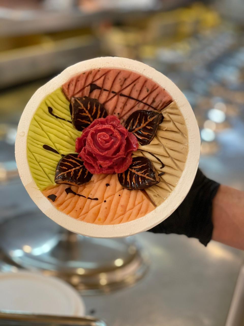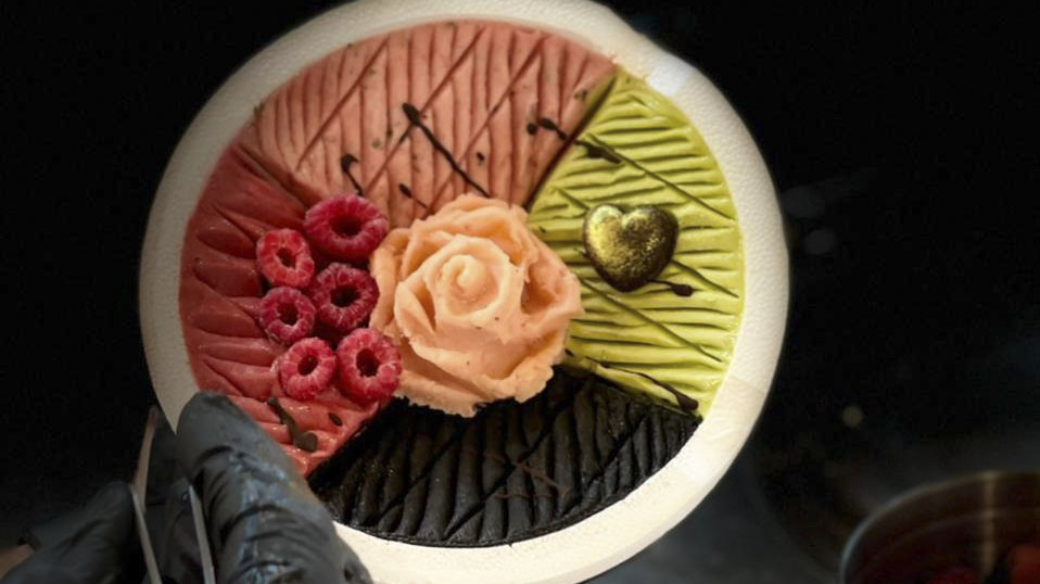 Postre (para compartir): Marquise de chocolate amargo, helado artesanal de mascarpone, texturas de frutos rojos, pistachos y sal rosa. Acompaña Mythos Noble Tardío.