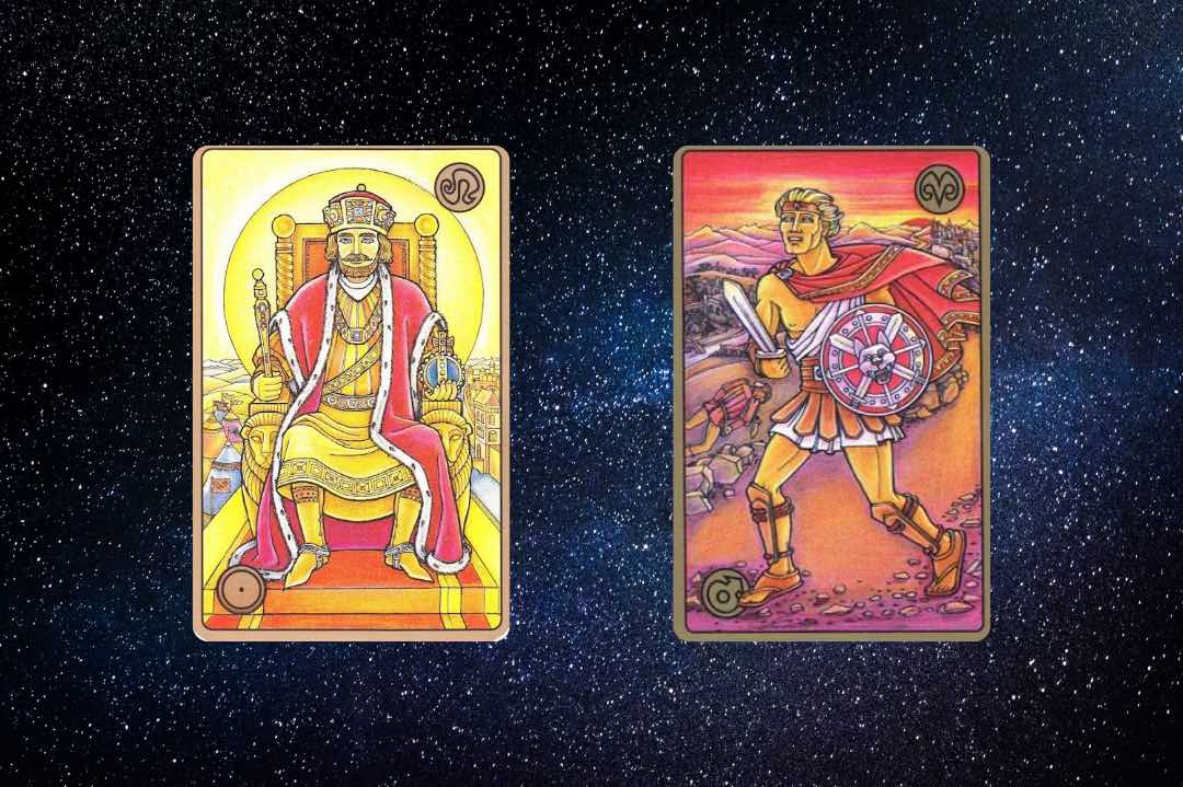 Teniendo eso en cuenta, elegí dos cartas: el Emperador del tarot y el Guerrero del mazo Symbolon. Ambas encarnan la fortaleza interior y la seguridad en uno mismo que distinguen a todo ariano de corazón. En ellas se manifiesta el poder y la valentía que nacen de mantener un vínculo sano y consciente con uno mismo.