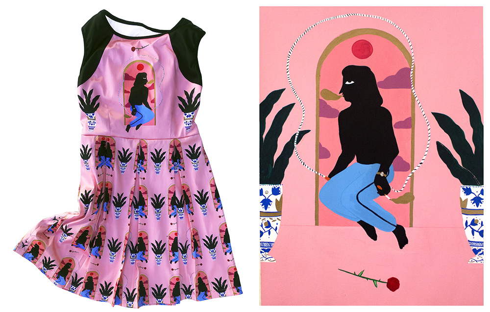 Para ograr que las pinturas se tranbsformaran en estampas, se trabajó con la técnica de collage digital. Las ilustraciones del artista se idearon sobre las prendas, los personajes fueron tomando vida en los textiles, se buscó en las escenas pintadas, detalles ocultos, como una rosa olvidada que fue transformada en una estampa.