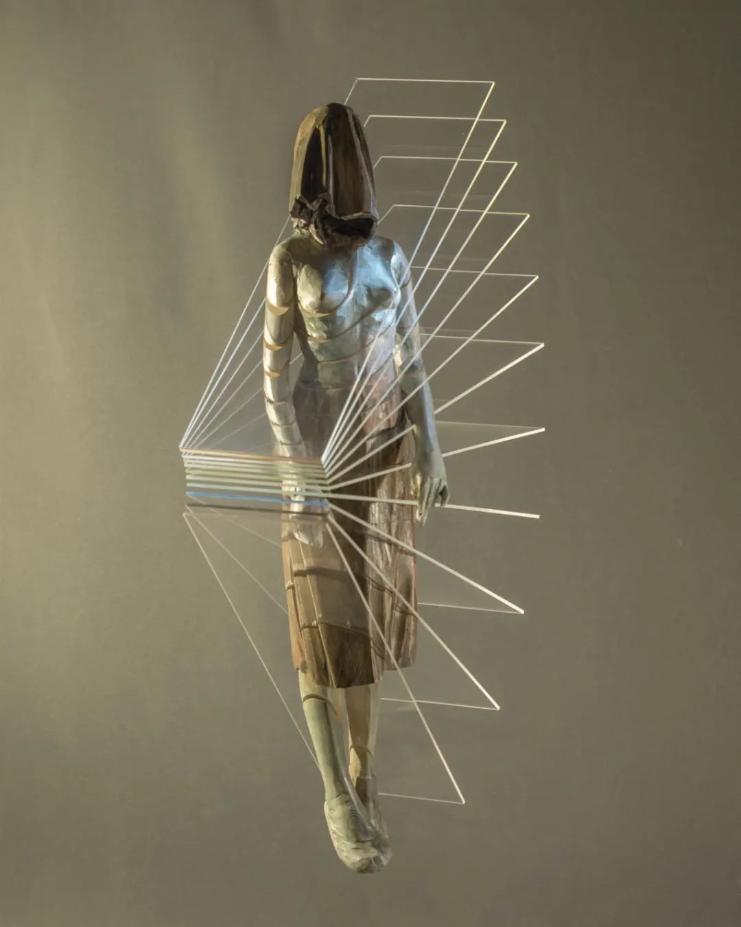 Junto a Iván Delhez, Fernando presenta una talla en pino patinada que irradia luz, gracias al acrílico coloreado que es obra de Delhez.
