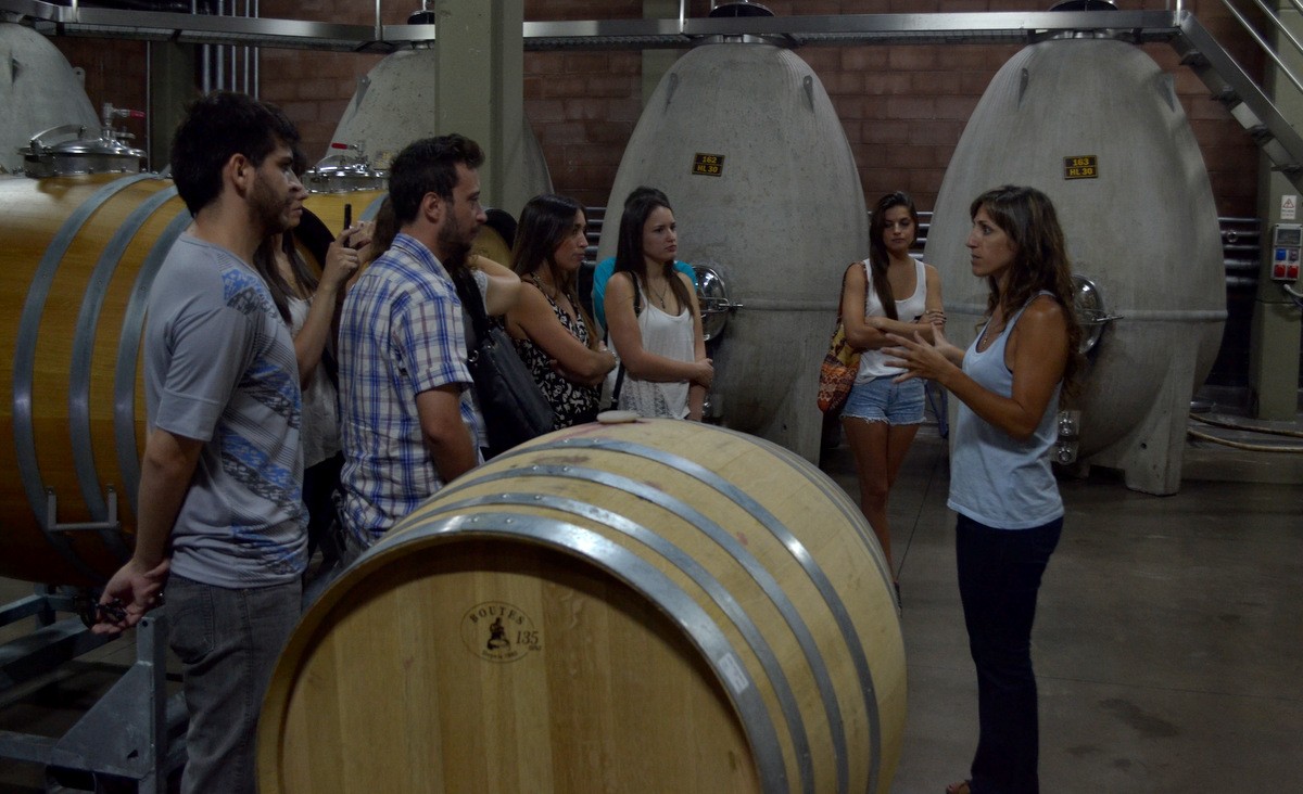Carolina estuvo acompañada por sus amigas María José y Juliana. Facundo, por su parte, llegó junto con Mariana, Belén y Nicolás. Todos fueron recibidos con una copa de Malbec de Crios y luego comenzaron con una visita guiada por la bodega Dominios del Plata, a cargo de Leticia Fragapane. A diferencia de otras visitas guiadas, esta fue muy detallada e ilustrativa, e incluyó el relato de los procesos de elaboración del vino.