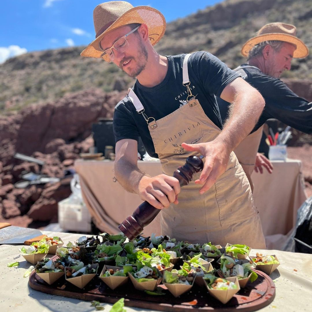 César y Benjamín Montes de Oca son padre e hijo, dos chefs experimentados que aman la comida y la hospitalidad. Por eso decidieron ofrecer su propia experiencia gastronómica mendocina desde adentro, a orillas del dique Potrerillos, «en un restaurante a puertas abiertas, sin techo ni paredes, con mesas y sillas movibles».