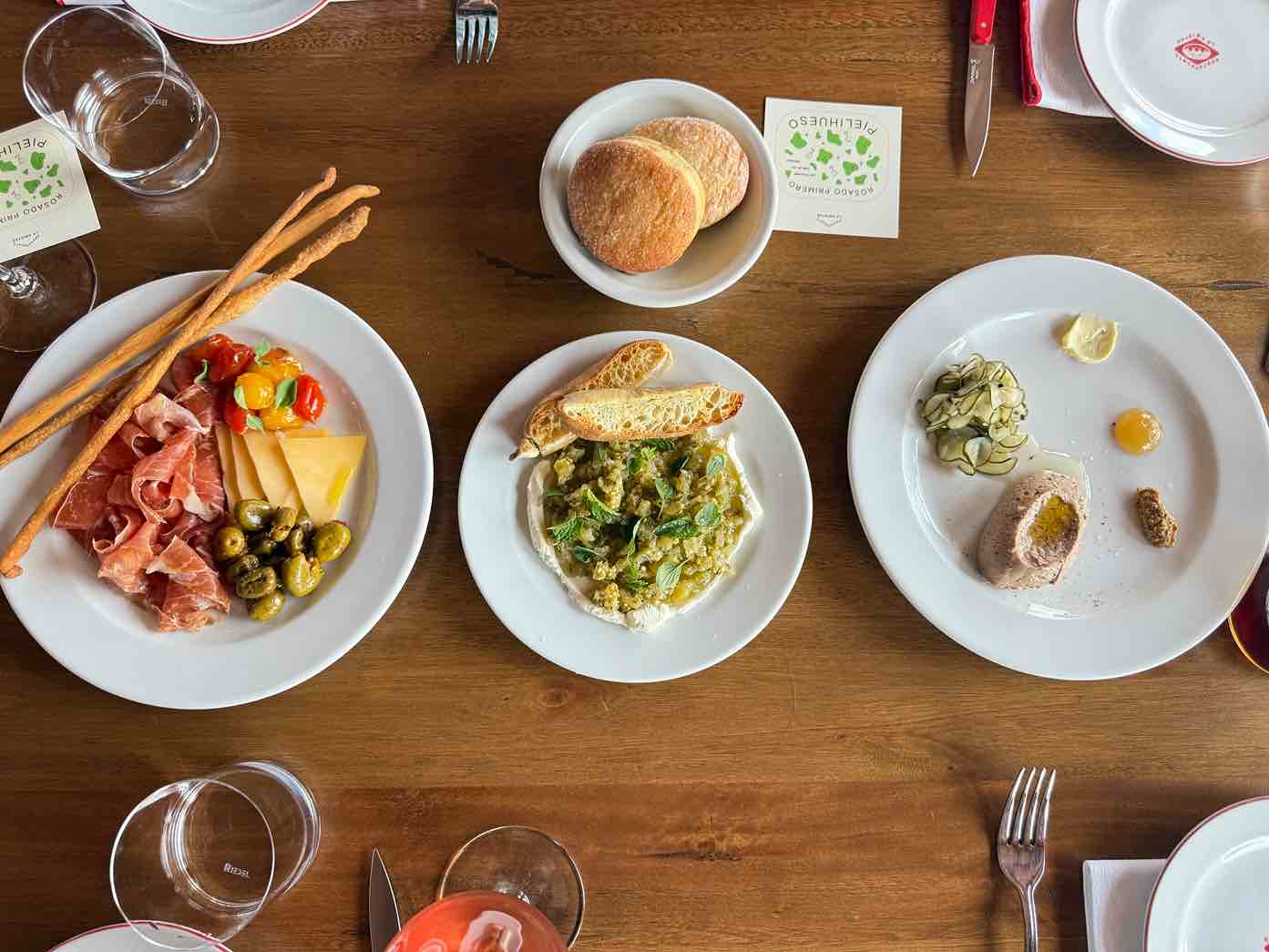 Antes de ir al restaurante hicimos una recorrida rápida por la bodega. Es chiquita, bastante artesanal, con mucha identidad. Después sí, a la mesa. La dinámica es relajada, compartida, variada. Arrancamos con algunas entradas y hubo una que destacó fuerte: la tortita mendocina con paté de pato, con pickles, manteca batida y mermelada de cebolla. El concepto es muy simple, aunque difícil de ejecutar con tanto éxito en 5 paladares distintos.