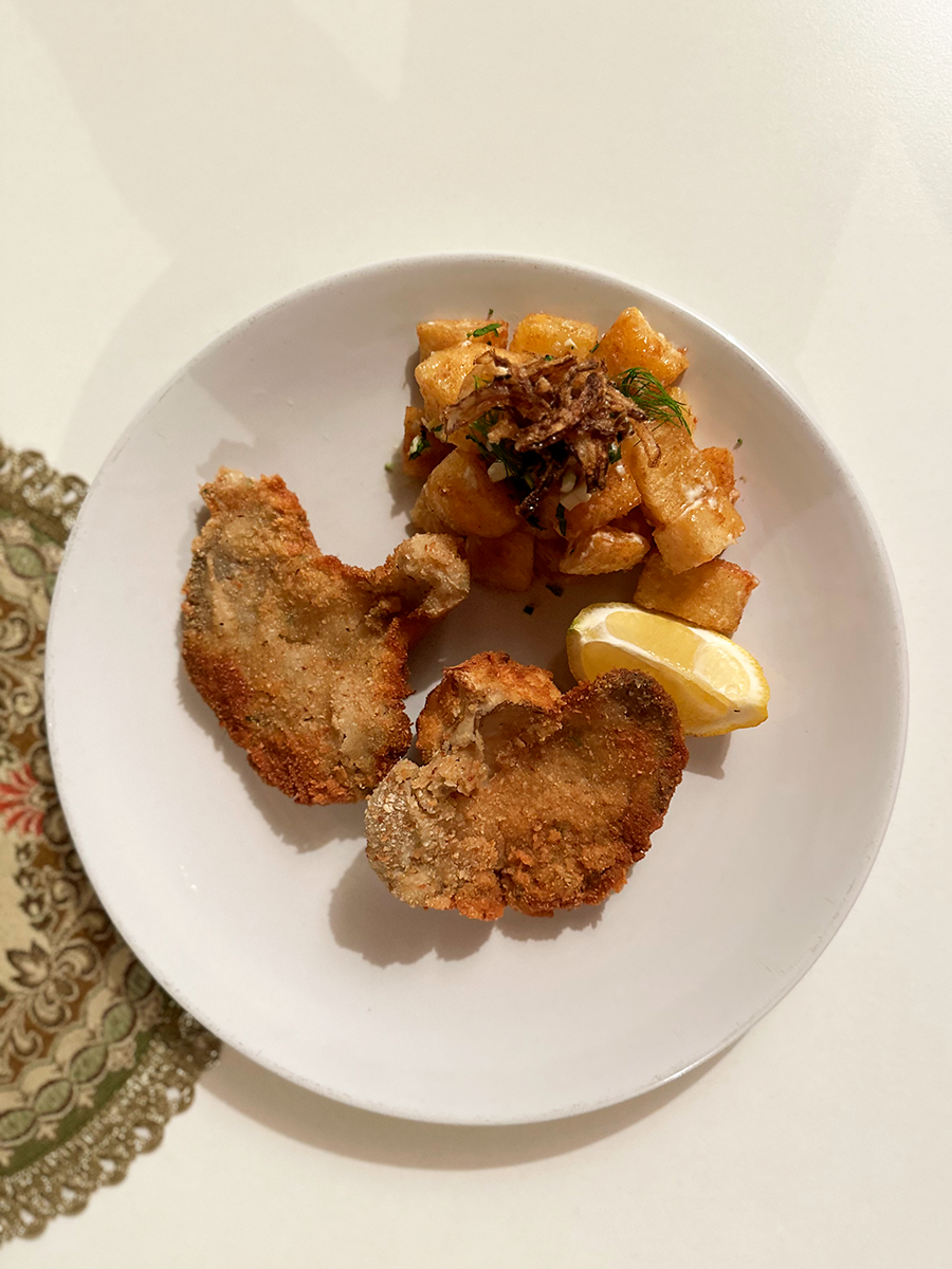 Luego, para culminar una cena increíble, llegaron a la mesa milanesas de girgolas con papas en tres cocciones y muhammara de garbanzos, una comida de sabores intensos que reflejan una cocción lenta de horas y horas de ebullición con tostador debajo de la olla.