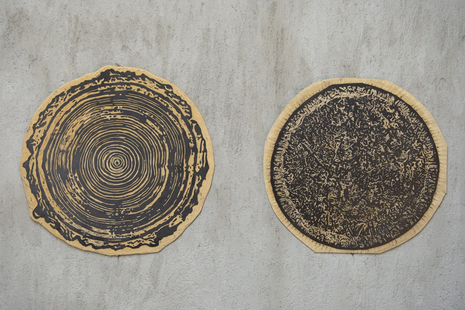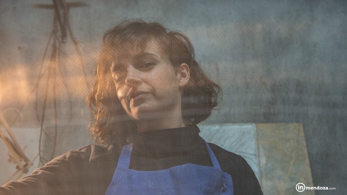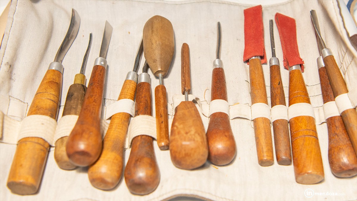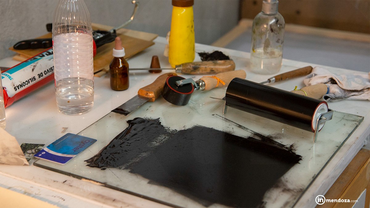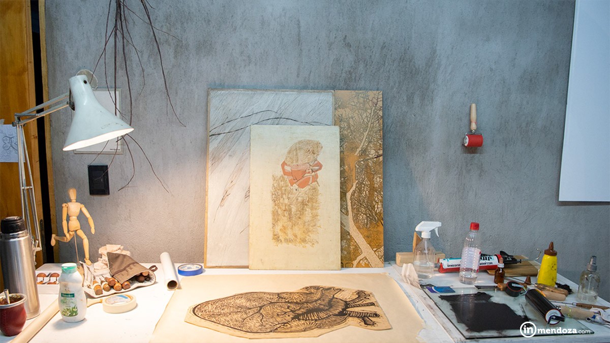 Ingresamos al taller donde nos cuenta sobre su trabajo. Una habitación con todos los detalles: una prensa, ilustraciones «pegadas» en la pared, obras colgadas, ramas y frutos secos de árbol como parte del decorado, gubias, cuadros, dos mesas y una ventana con vista al jardín que invita a renunciar de todo pensamiento como si fuera una obra de arte más.