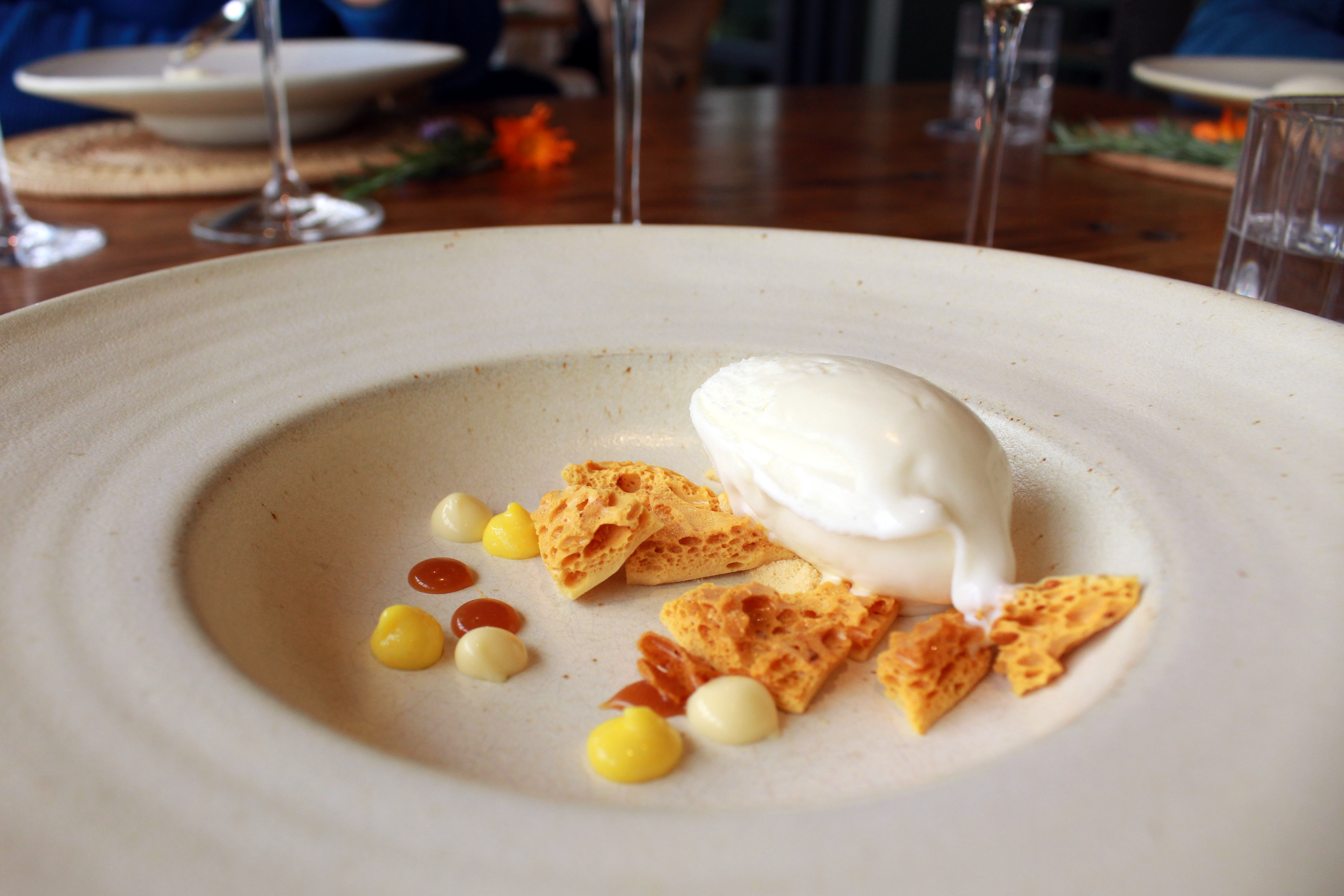 Un sorbet de nopal y gel de limón llegó con su astringencia a limpiar el paladar y predisponernos para lo que fue el dulce: helado de romero con textura de miel y limón, honeycomb, gel de limón, crema de limón, salsa tofy y polvo de caramelo. Fue maridado con un Blanc de Noir 2019 Brut Nature.