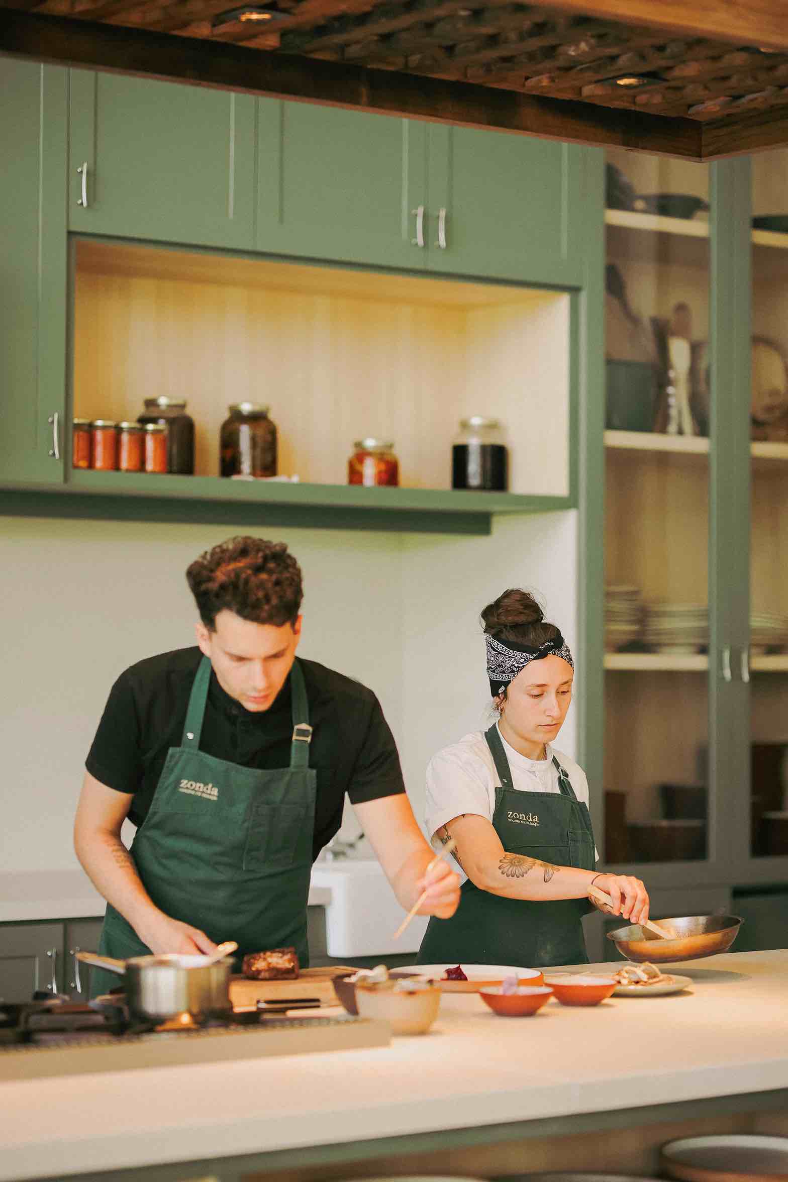 La transparencia no solo se expresa en el origen de los platos, sino también en la forma en que se elaboran: a la vista de todos y en plena armonía con el entorno. Su cocina abierta permite que no exista distancia entre cocineros y comensales. Así, la energía del equipo en acción se mezcla con las conversaciones de las mesas. Cocinar a la vista, para el equipo de Zonda, es una forma de encuentro, de enseñar y de compartir. Incluso, en su experiencia Full Day, los visitantes pueden sumarse al ritual y preparar una tortita mendocina o hacer el repulgue de una empanada junto al equipo.