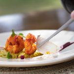 Y para quienes deseen hacer más pasos -cinco- se sirve un entremés de langostinos con salsa de brócoli y chimichurri de frutos rojos; pre-entradas de pulpo con sable de pimientos, cremoso de papa y berenjenas ahumadas con puntos de menta con ajo, y una entrada de strudel de conejo con crema de maíz y chips de remolacha.