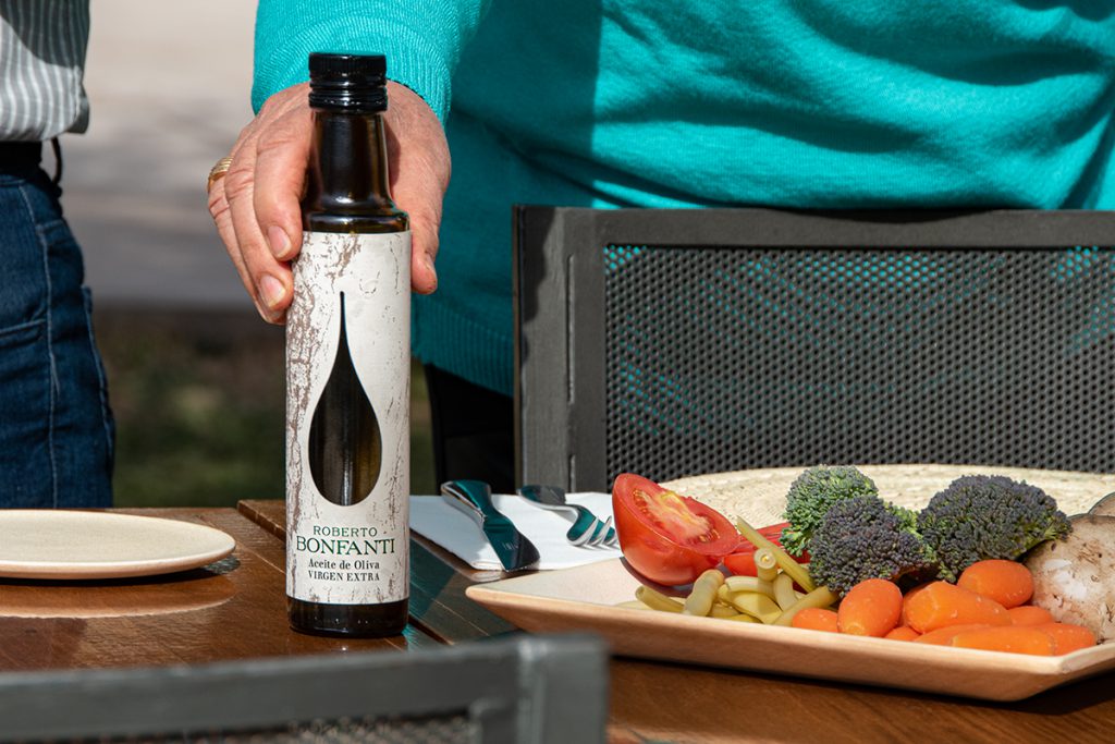 En el restó se utiliza y se sirve el propio aceite de oliva de la familia Bonfanti, un varietal Arauco con porcentaje de manzanilla para bajar su intensidad, elaborado con materia prima de sus olivares y es 100% extra virgen primer prensado.