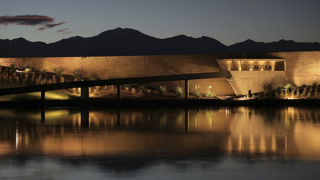 «Tanto la bodega como casa de visitas forman parte de un conjunto que dialoga entre sí, donde las visuales hacia la Cordillera entre lagunas de riego utilizadas escenográficamente, permiten un juego de imágenes, reflejos y sonidos del agua que recuerdan que Anaia pertenece al sistema del oasis central de Mendoza, donde el agua como recurso cumple un rol fundamental y a la que se homenajea. El diseño de la bodega está inspirado en la tierra y el paisaje de Mendoza; en su topografía de montañas; en la flora xerófila de sus cerros; en la textura y el color de sus rocas milenarias, y en el cambio de tonalidades terrosas, que responde a distintos estratos que fueron sedimentando a través de miles de años», comenta el arquitecto Gabriel Japaz.