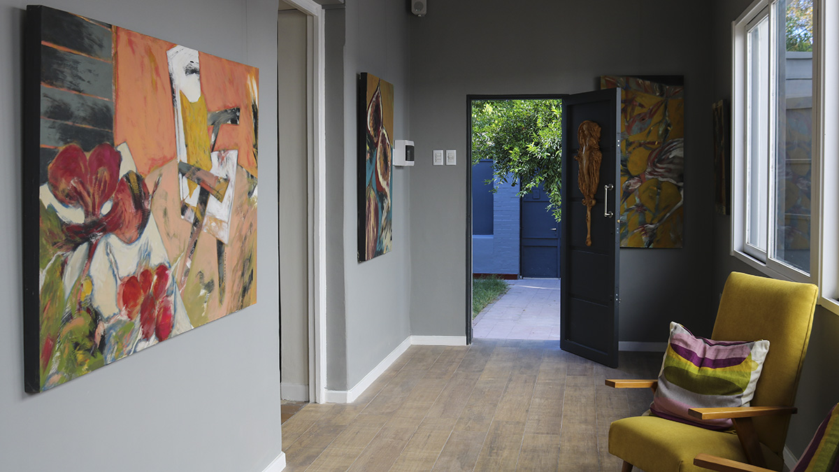 Una clásica galería mendocina con grandes habitaciones muestra sus cuadros centrados en animales, flores y colores. Pero también sus muebles y más paredes con murales, porque nació y creció pintando y nunca deja de pintar lo que se le cruce por delante.