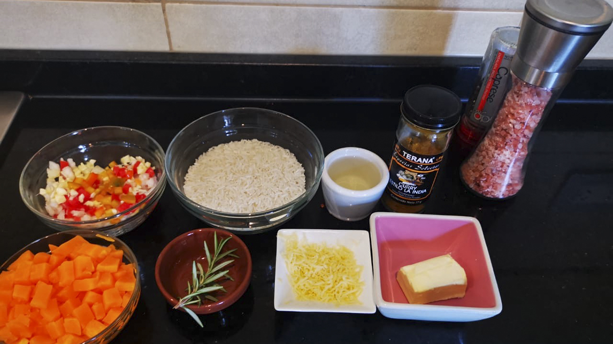 Vas a necesitar: Ajo, cebolla y pimiento picados bien chiquitos; calabaza cortada en cubos, arroz, romero, vino blanco y especias que tengas en casa; queso de rallar y manteca. Para el pesto, albahaca, un diente ajo, aceite de girasol u oliva, maní picado, sal y pimienta.